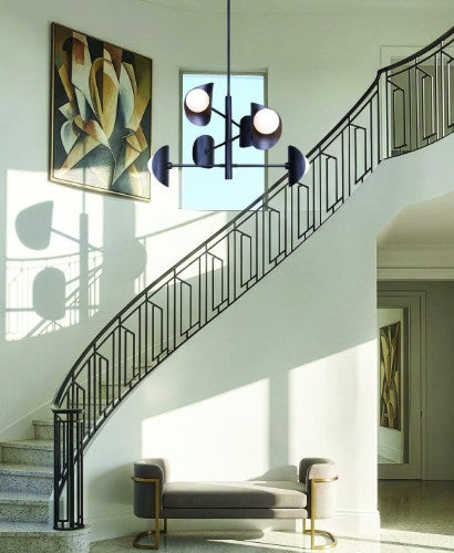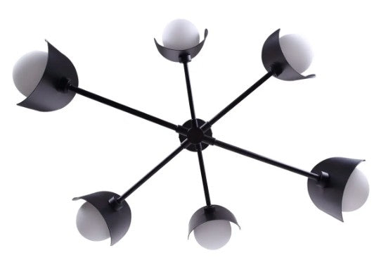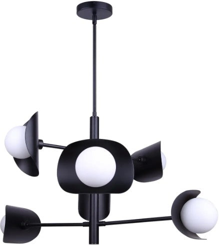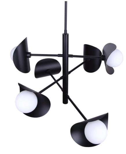 The ARION chandelier is a bold statement of design, where maximalist expression meets mid-century modern refinement. Its cluster-like form, with six round, flat opal glass shades, creates a sculptural presence that commands attention without overpowering a space. The matte black frame contrasts beautifully with the soft, glowing spheres, creating a dynamic balance of drama and harmony. Adjustable from 27" to 69" high, this piece adapts to diverse interiors while amplifying personality and style. The ARION is more than lighting; it is art that elevates every project, from modern apartments to curated living spaces. This is a chandelier for those who embrace daring design with lasting impact.