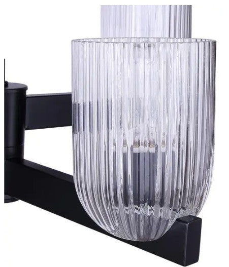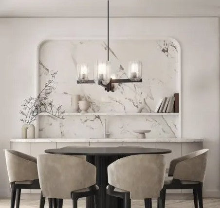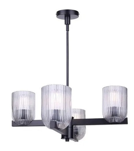 The RENZO chandelier blends bold presence with subtle luxury, featuring a matte black frame and clear ribbed glass shades. With four lights, it balances strength and refinement, offering illumination that feels both striking and inviting. The ribbed detailing on the glass adds texture and dimension, complementing the smooth black finish for a contemporary yet timeless effect. Measuring 23 inches wide and adjustable from 17.25 to 59.25 inches, RENZO adapts easily to dining rooms, living spaces, or entryways. Designed for four 60W Type A bulbs, this chandelier is a statement piece for modern and eclectic interiors alike.