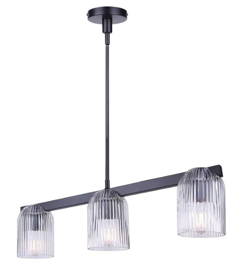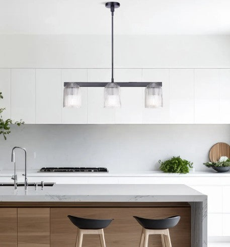 The RENZO 3-light chandelier adds architectural edge to contemporary interiors with its bold matte black frame and clear, ribbed glass shades. The modern design offers both focused illumination and striking visual presence. The ribbed glass adds texture, balancing strength with refined detail for a look that feels modern yet timeless. Measuring 28 inches wide and adjustable from 13 to 61 inches, RENZO adapts beautifully to dining rooms, kitchens, or living areas. Subtle luxury and bold design meet in this versatile fixture, perfect for statement-making interiors.