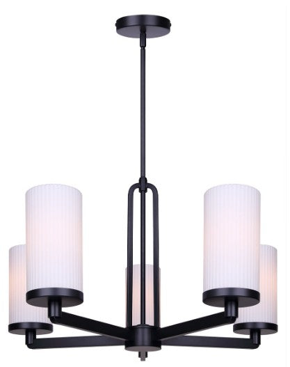 The KINSLEA 5-light chandelier blends matte finish and quiet craftsmanship to create a presence that is calm, considered, and enduring. Lighting embraces matte over glossy, tactile over flashy, favouring subtle texture and an elegant finish. Its matte black frame pairs with flat opal ribbed glass shades, offering a soft, tactile surface that diffuses illumination into a warm, balanced glow. Adjustable from 24.5" to 66.5" in height, this chandelier adapts effortlessly to a variety of spaces, from dining rooms to living areas. Every detail reflects understated luxury, celebrating subtle beauty born of quality and authenticity. KINSLEA transforms everyday illumination into an enduring statement of calm, refined style.
