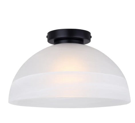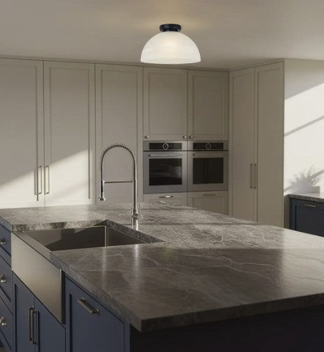 The MAREK flush mount embodies the essence of understated luxury, where matte finishes and tactile textures take precedence over glossy excess. A matte black base anchors the softly domed alabaster glass shade, its marbled surface adding quiet depth and refinement. The glass diffuses light into a warm, layered glow that feels grounding and serene, perfect for creating calm moments in everyday spaces. At 13 inches wide, MAREK offers balanced illumination without overwhelming, making it ideal for bedrooms, entryways, or hallways. With its timeless profile, durable craftsmanship, and focus on subtle elegance, this 1-light flush mount favours longevity and sophistication over fleeting trends.