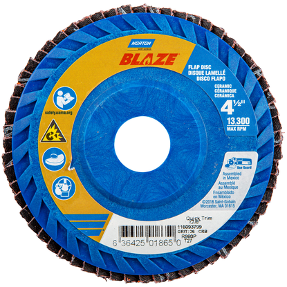 Get a cool and fast cut rate on your blending, deburring and stock-removal projects with the Blaze R980P coarse grit center mount plastic flat flap disc. The type 27 flat flap disc has a ceramic alumina abrasive grain that gives you up to a 200 percent longer life on hard-to-grind materials, making it a cost-efficient choice. The Y-weight polyester flaps resist fraying and retain grains, while the flexible plastic backing plate allows for some flexibility.
