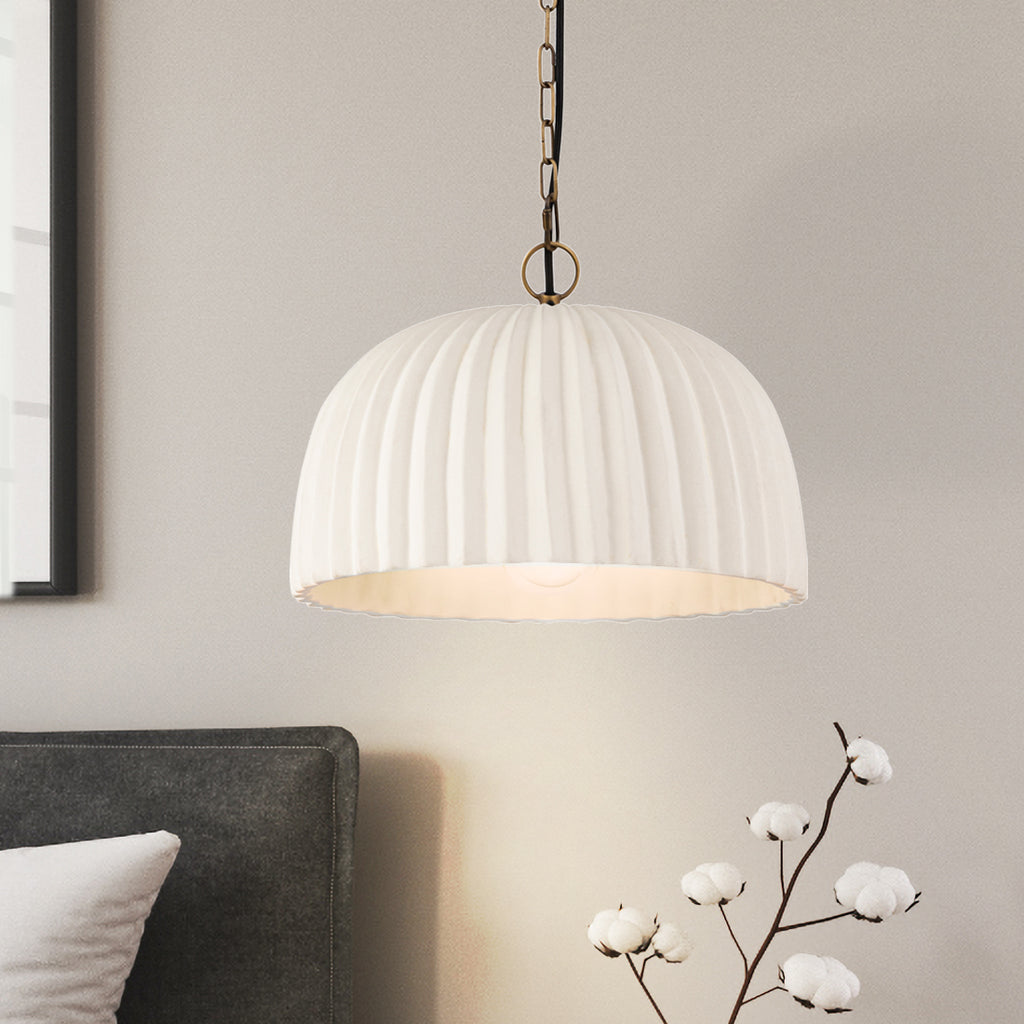 Introducing Audrey, a captivating pendant light featuring a ceramic shade that infuses warmth and texture, complemented by a ribbed pattern that enhances its aesthetic allure. Ideal for kitchens, dining areas, or living rooms, the Audrey pendant light provides both stylish illumination and an artful presence.