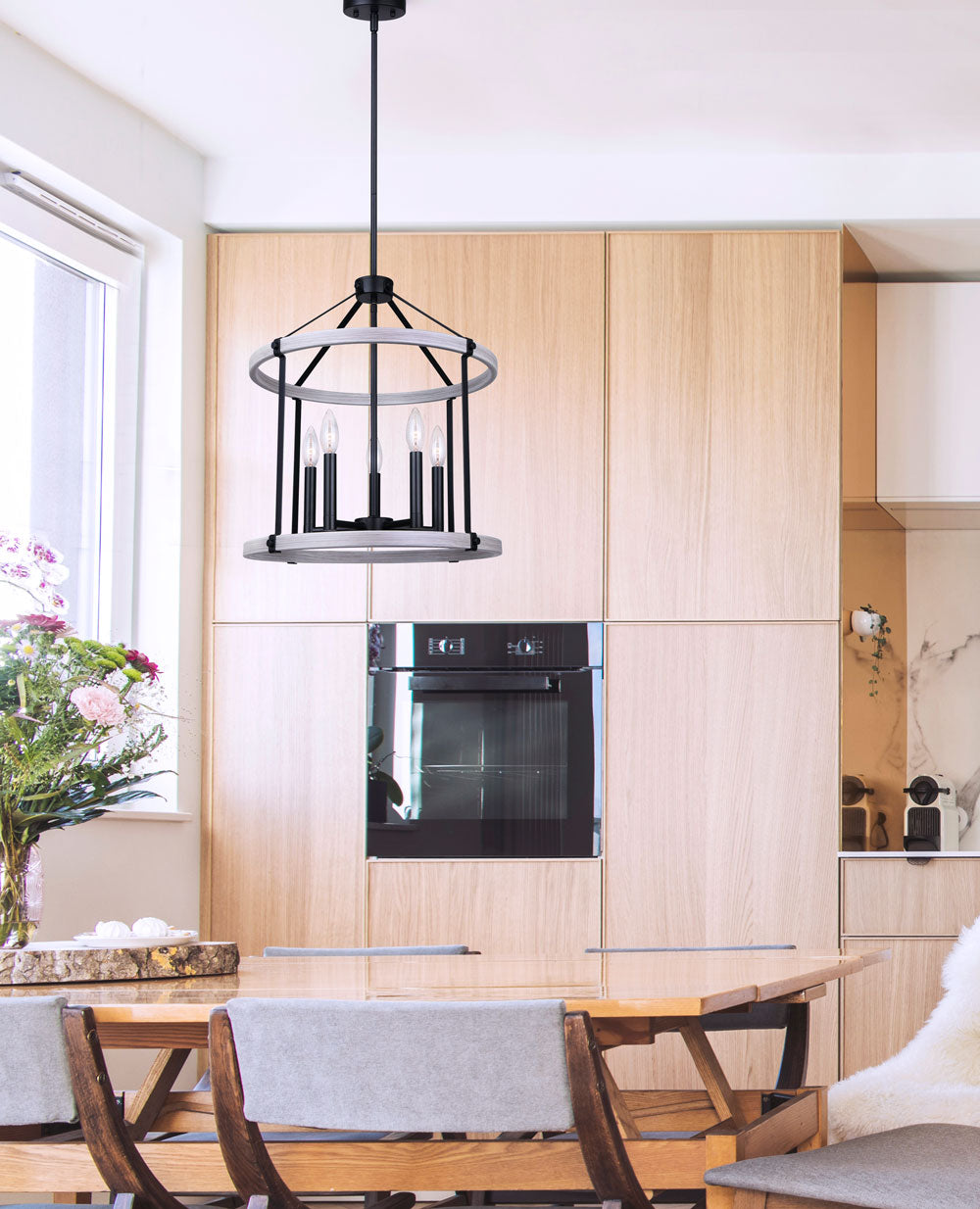 CANARM takes the sleek lines of a modern style, mixes it with a cozy farmhouse aesthetic, and creates a beautifully updated country living-inspired look in the form of JOELLE, a 5-light chandelier. You can't go wrong when you combine a brushed grey finish with a matte black metal with your lighting, it echos the feeling of a welcoming modern rustic breath of fresh air.