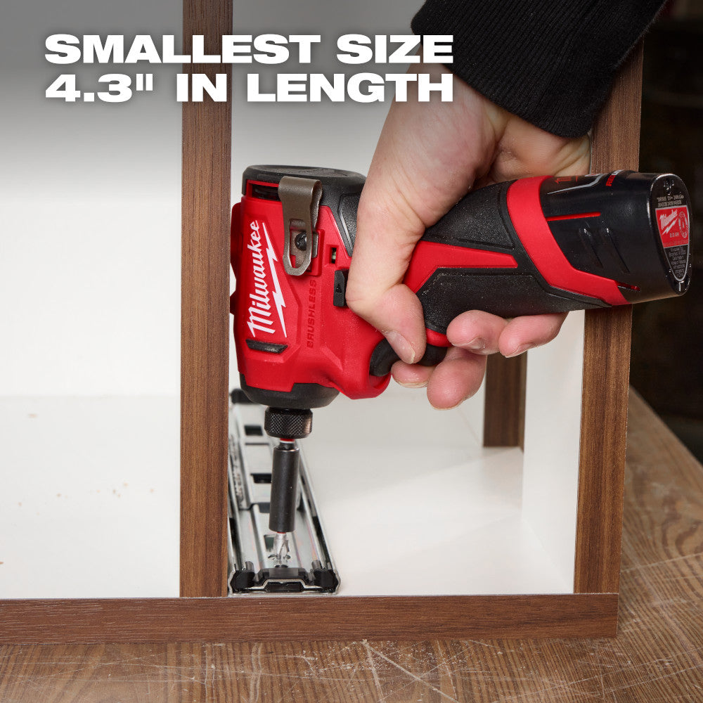 The MILWAUKEE® M12™ Subcompact Brushless 2-Tool Combo Kit features the most compact and lightest weight drill and impact driver, providing ultimate access into tight spaces. This kit includes the M12™ Subcompact Brushless 3/8" Drill/Driver, M12™ Subcompact Brushless 1/4" Hex Impact Driver, (2) M12™ REDLITHIUM™ CP2.0 Battery Packs, M12™ Charger and Contractor Bag. The compact drill is only 5.4" long and under 2 pounds with a battery, allowing for minimal fatigue and excellent control, especially while working overhead or in tight spaces. The brushless motor delivers optimal tool performance at 350 in-lbs. of torque and up to 1,550 RPM, tackling a wide range of drilling and fastening applications. The drill features premium components, including a 3/8" metal chuck that provides best-in-class durability. The impact driver measures only 4.3" in length and 2.0" in width, allowing for best access in tight spaces and weighing only 1.7 pounds with a battery. The brushless motor technology provides faster driving speeds with 1,100 in-lbs. of torque and up to 3,000 RPM to increase productivity. An internal metal gearcase delivers robust strength and durability. MILWAUKEE® REDLINK™ Intelligence communicates with the M12™ REDLITHIUM™ batteries to provide optimal performance for the tools. The M12™ Subcompact Brushless 2-Tool Combo Kit is part of the M12™ system, fully compatible with over 150+ solutions.