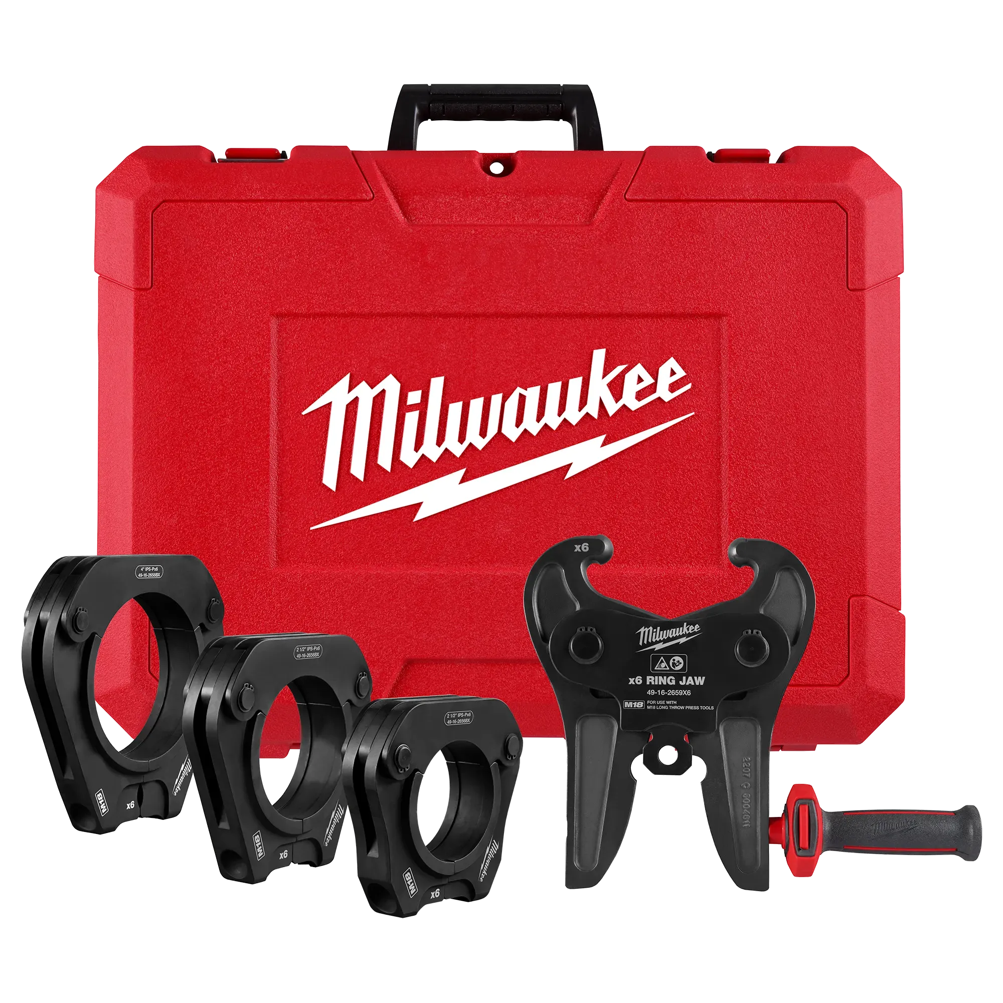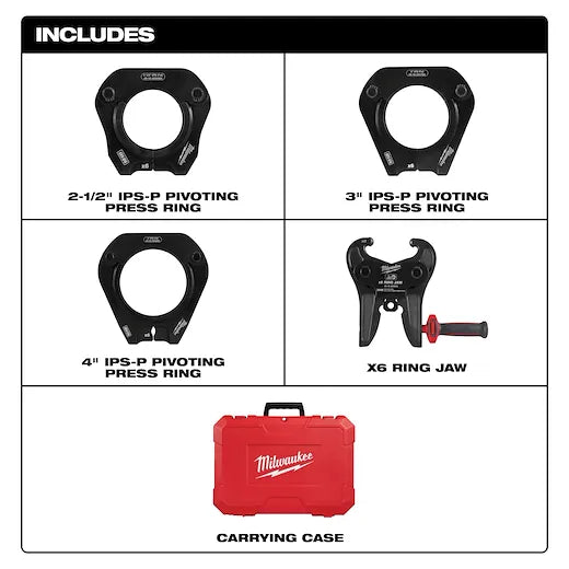 The Milwaukee IPS-P Pivoting Press Ring Kits are designed for use with M18™ FORCE LOGIC™ Press Tool on Viega® MegaPress®, Apollo® PowerPress® and other press fitting systems. The IPS-P Pivoting Press Ring Kit is a more efficient alternative to welding and threading, enabling you to press connections on schedule 5 up to schedule 40 black iron pipe and 304/316 stainless steel pipe. Pivoting functionality delivers greater access in tight spaces when paired with a compatible Milwaukee® Ring Jaw and FORCE LOGIC™ Press Tool. The press blocking system prevents improper ring and ring jaw mismatch, providing peace of mind in quality connections. The IPS-P Pivoting Press Rings, combined with a compatible Milwaukee® Ring Jaw and in-line FORCE LOGIC™ Press Tool, deliver unrivaled access in tight spaces and around installed pipes, providing you with controlled, flameless copper connections for unmatched productivity.