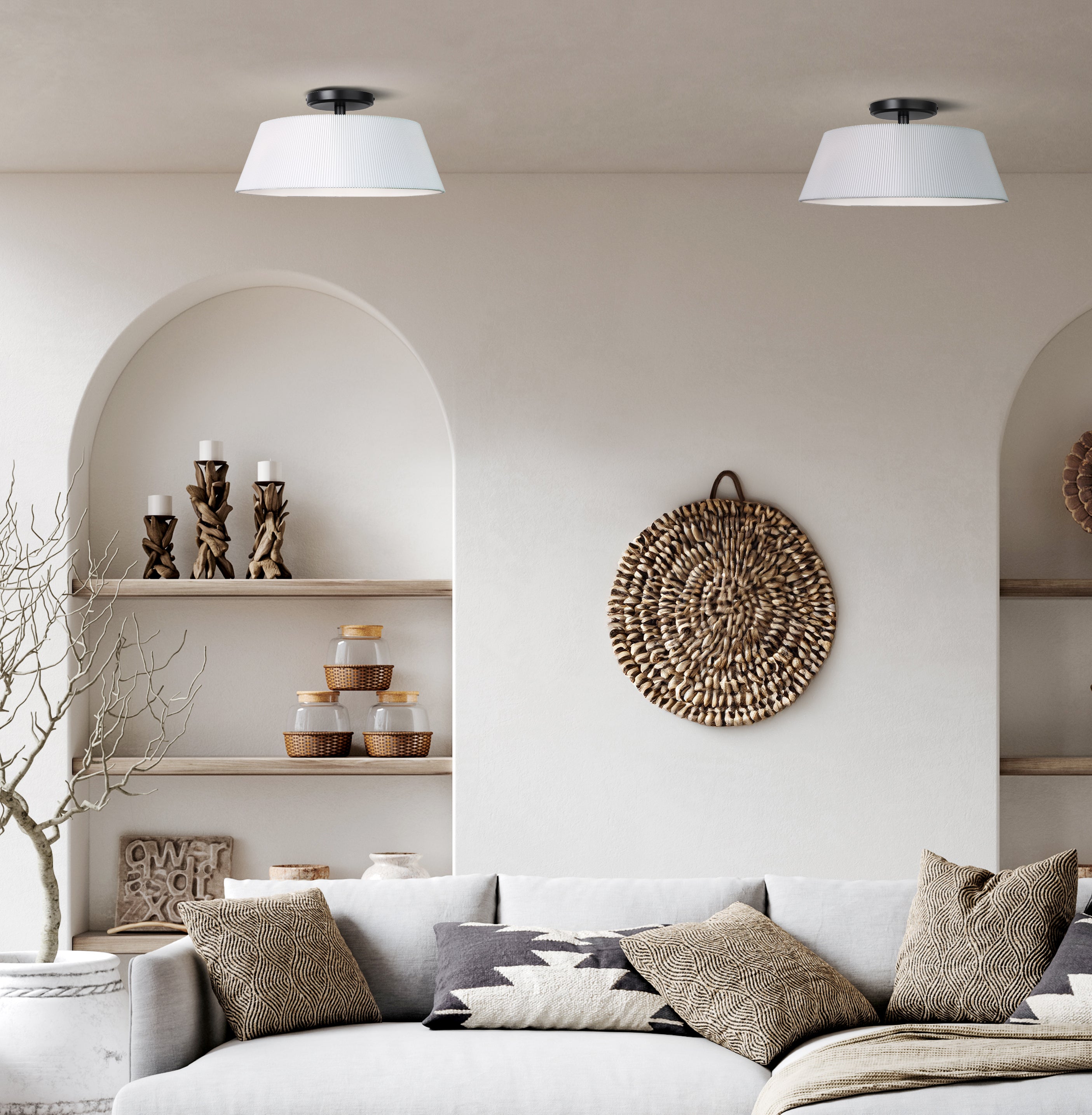 Meet Aspen, the timeless statement piece that blends simplicity and charm. This stunning black flush mount features a crisp, pleated white fabric shade. Its clean lines and balanced design create a perfect harmony of modern aesthetics and classic appeal. Whether illuminating a dining room or adding warmth to a living space, this fixture exudes a soft, inviting glow, becoming a focal point in any room.