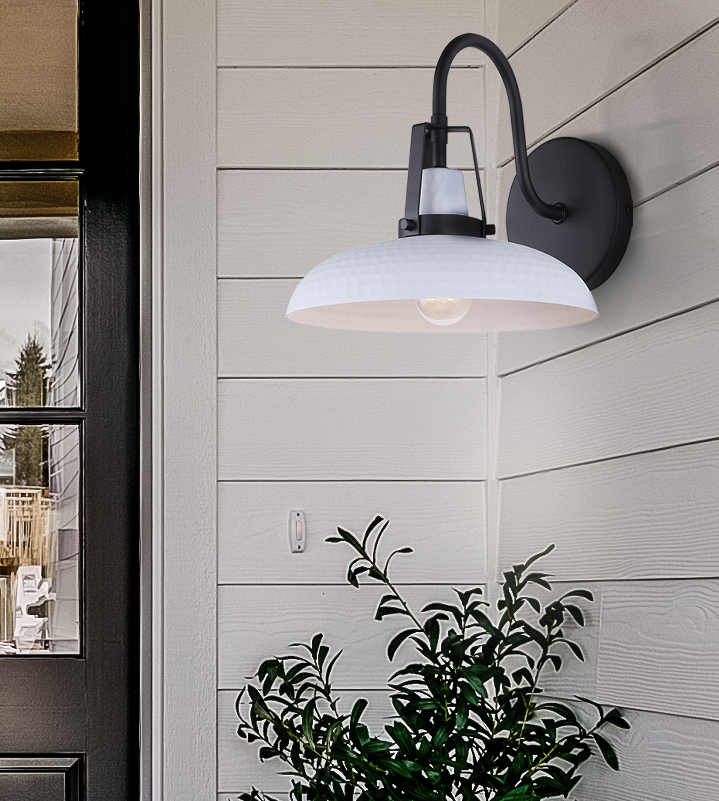 Bring charm to your outdoor spaces with the beautifully crafted wall light, Jodi. Its black frame is paired with a textured white shade, creating a perfect balance of contrast and refinement. The hammered finish adds an artisanal feel, while the curved arm design softens its bold silhouette. Jodi delivers style and warmth that transforms any exterior into a welcoming retreat.