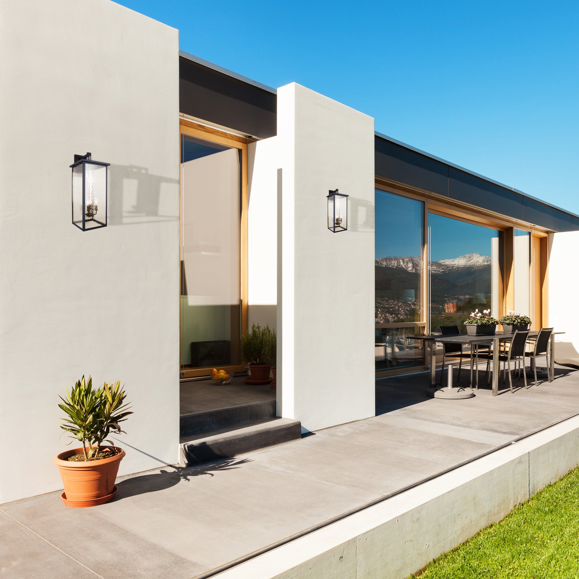 The SHANA outdoor wall light is a sleek and sophisticated addition to your outdoor space. Perfect for illuminating entrances or patios, this modern fixture brings both style and functionality to your home. The clean rectangular design of SHANA adds a touch of contemporary flair, while its seeded glass panels and sleek black finish create a warm and inviting ambiance.
