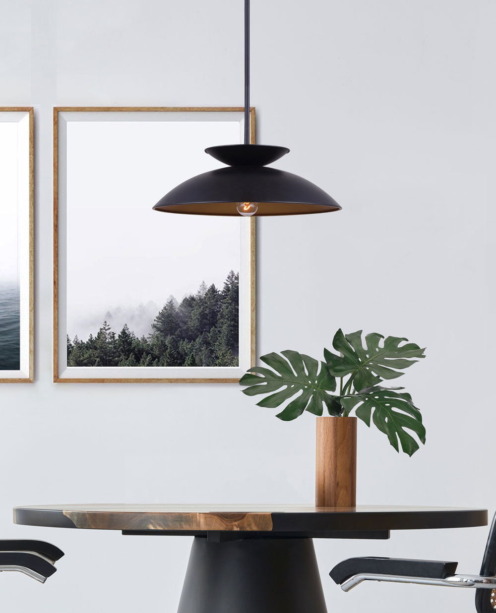 Minimalist mid-century meets modern Scandinavian with ZIVA, a simple yet distinctive pendant light. ZIVA's sleek, eye-catching look makes a statement without even trying, featuring a beautifully shaped metal shade in an ever-trending matte black finish with a single bulb hanging in the middle for down-light.