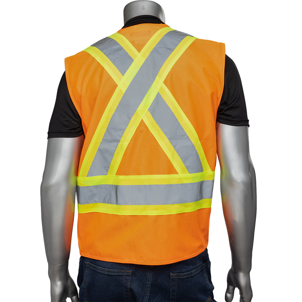 - Horizontal 360 degrees stripe around the body plus 2 vertical stripes in the front and an X in the back providing the worker total protection as they move to be seen from all angles