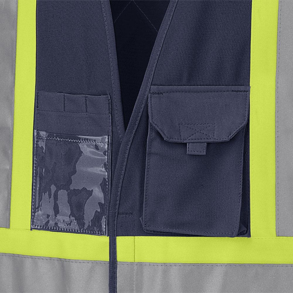 Chest Pen Slots, Transparent ID, Chest Cellphone, Inner, Lower Front with Flap and Hook and Loop |