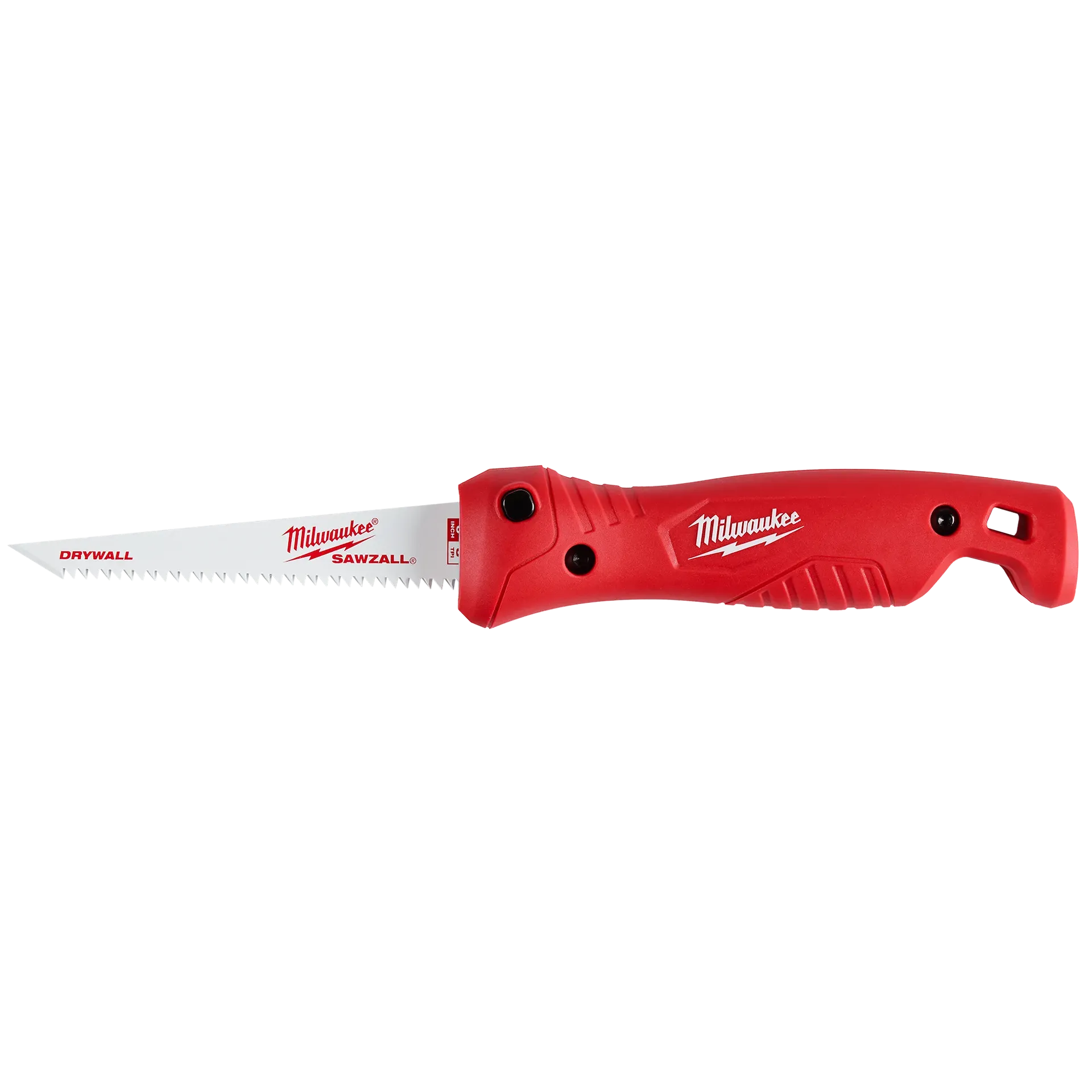 The Milwaukee® Folding Jab Saw fits all 6" Sawzall™ blades for quick cutting into multiple materials. The slide lock design offers the fastest blade change to increase productivity on the jobsite. The 6" 8TPI Sawzall Drywall Blade features a large piercing tip for easy plunge cuts and fleam ground teeth for smooth cuts. The blade easily folds into the handle to avoid piercing through tool pouches and bags. Complete with ribbed indentions to increase handle grip, the folding jab saw also features a lanyard hole for convenient tethering.