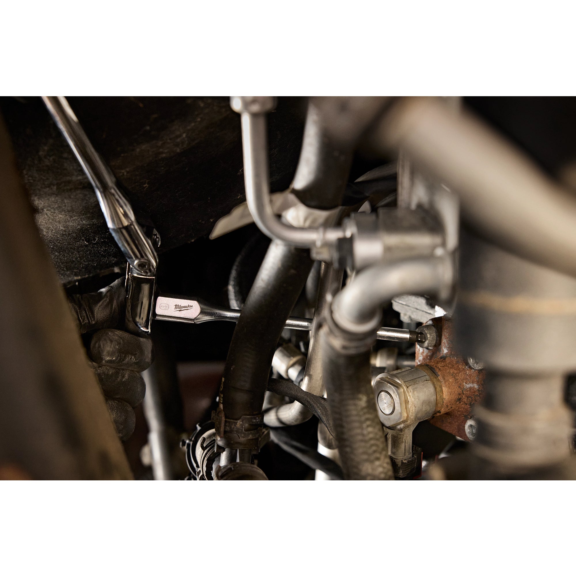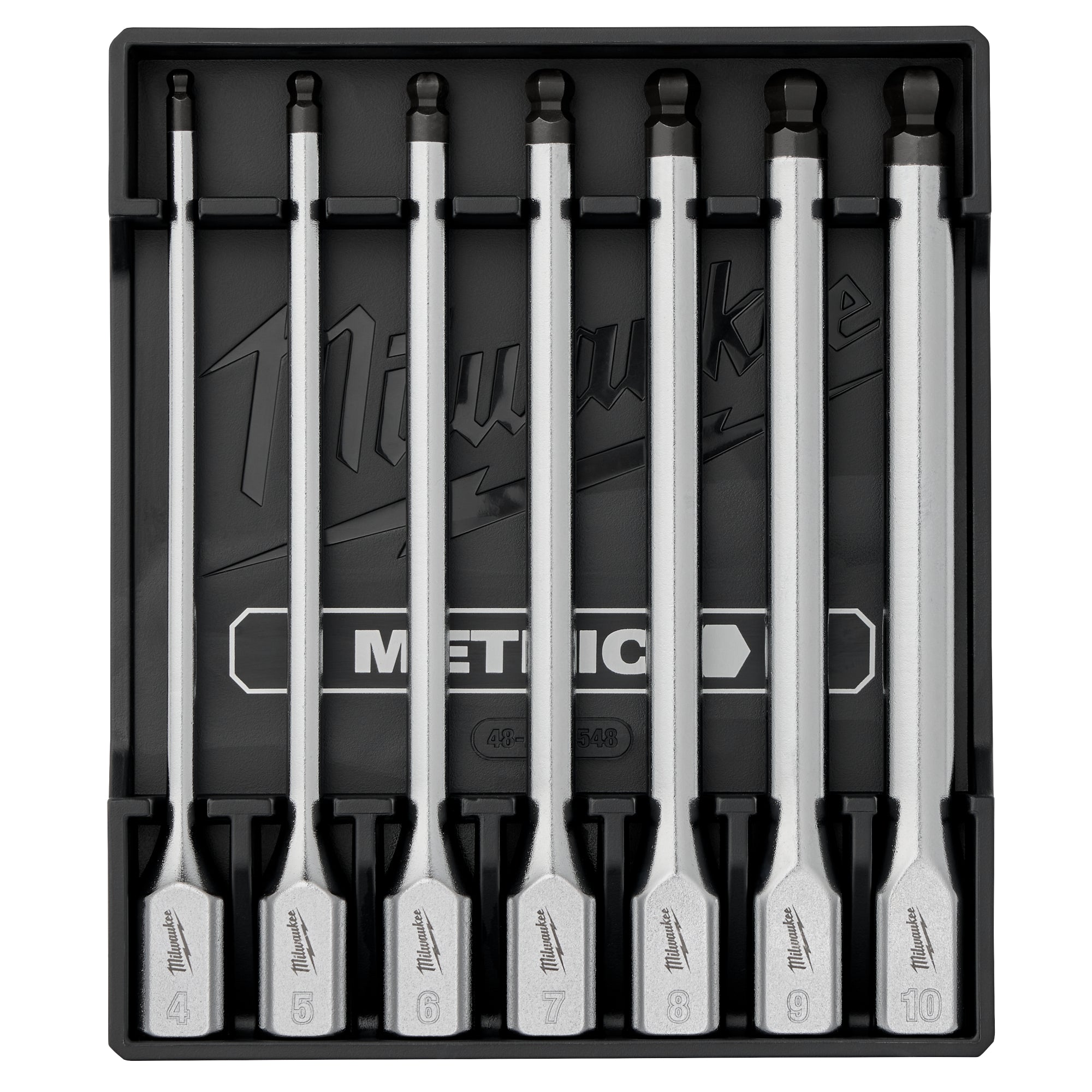 Our 7pc 3/8" Drive Metric Long Ball End Hex Bit Socket Set with FOUR FLAT™ sides is designed from the ground up to be part of the most versatile socket family. Milwaukee® long reach sockets feature an innovative design with four parallel flat sides, which deter rolling and are wrench compatible. The 6" length and slim profile of these sockets provide the best access in tight spaces, and the ball end design provides easy angled entry. The one-piece socket design offers improved durability compared to two-piece designs by eliminating the risk of the bit separating from the socket base. The laser-engraved size markings provide easy identification, and chrome plating offers rust and corrosion protection. This set also includes a storage tray for better organization. All Milwaukee® sockets are backed by a Lifetime Guarantee.