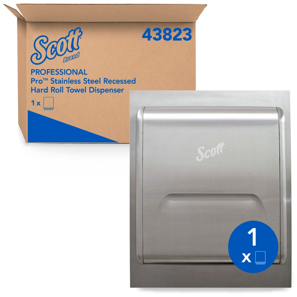 - 1 Dispenser Housing/Case; Scott® Pro Stainless Steel Recessed Hard Roll Towel Dispenser Housing with Trim Panel; Stainless Steel; 17.62" x 22" x 5.0"