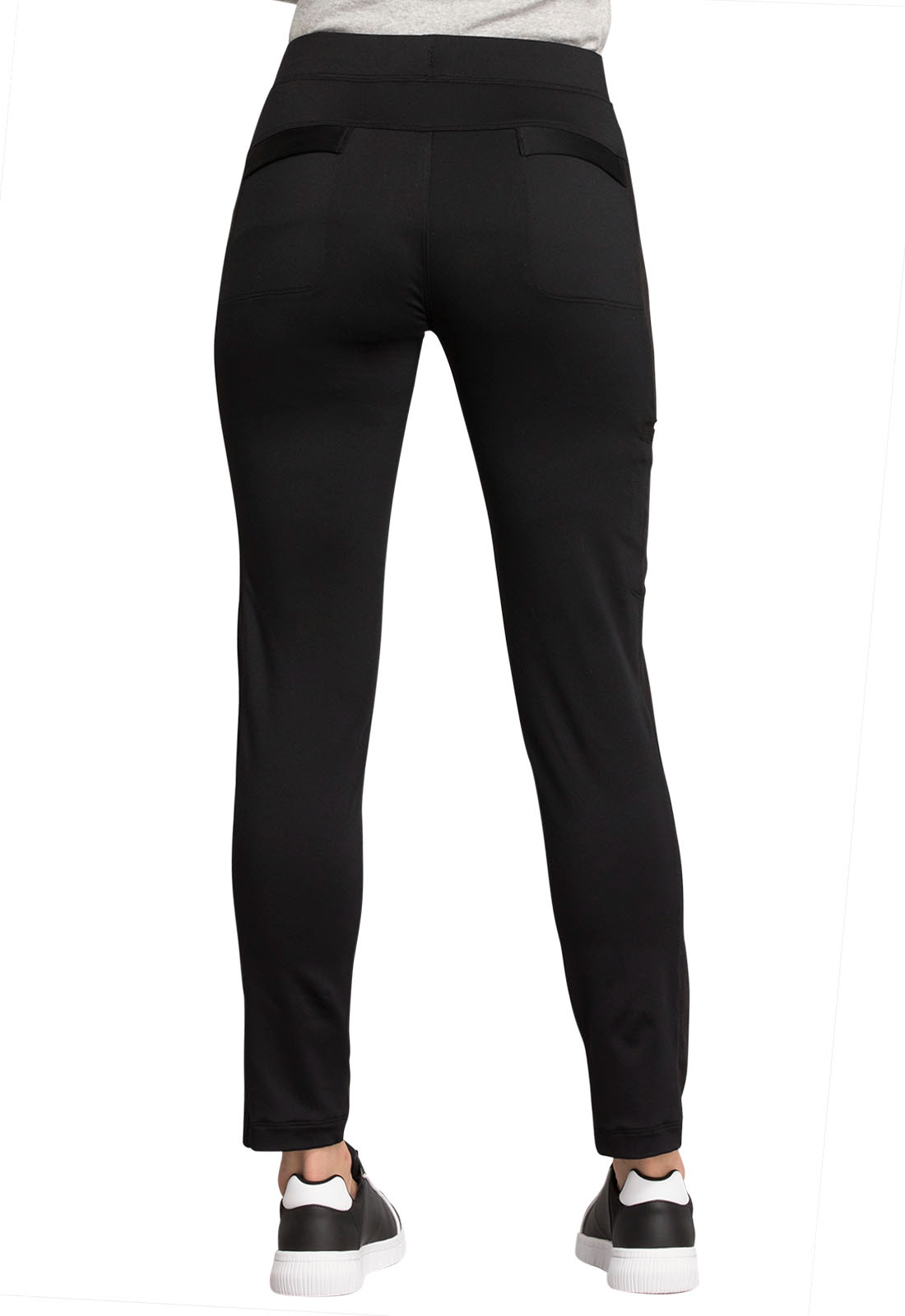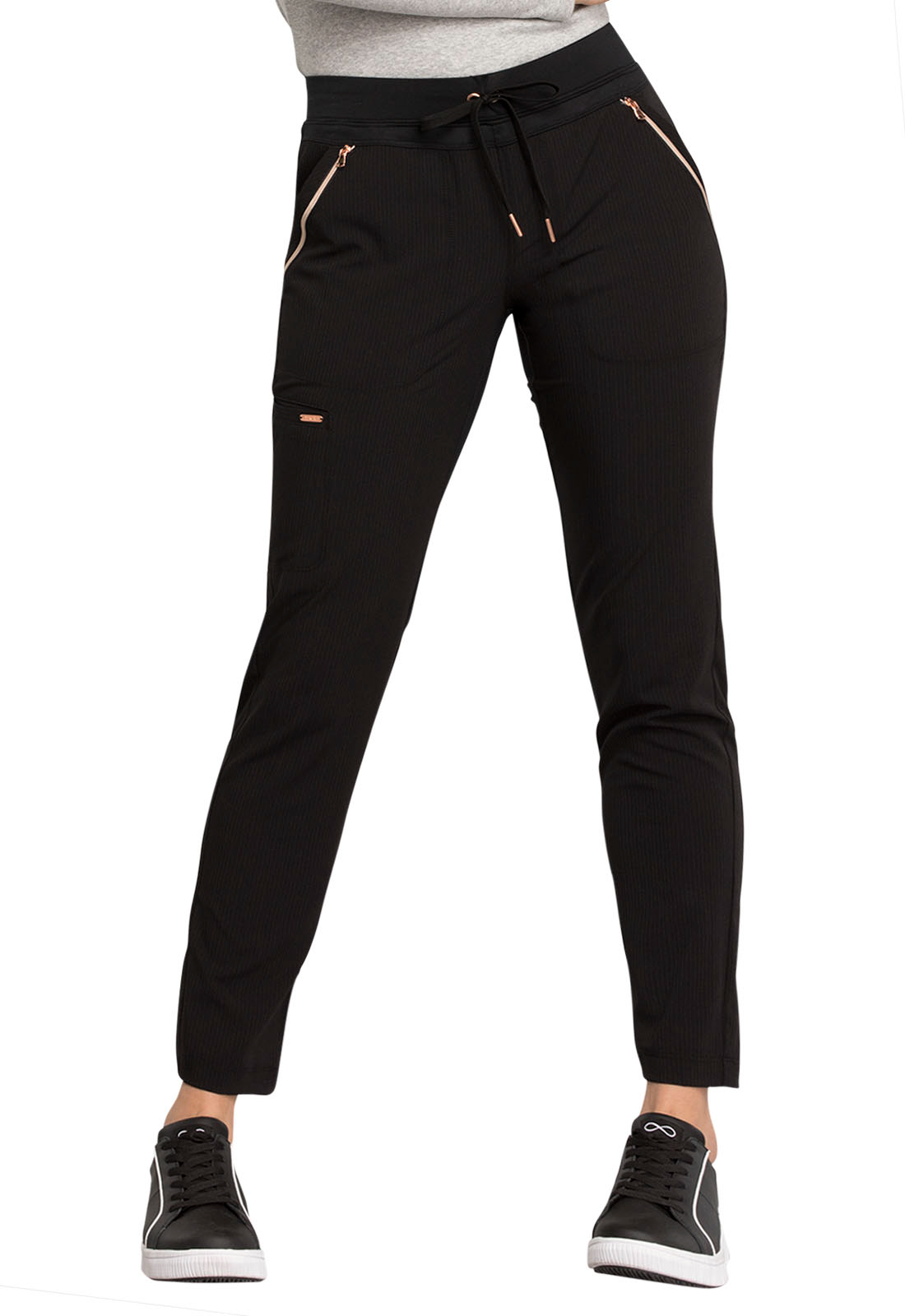 Pull-on styling, a figure-flattering cut, and a knit full back panel makes this mid rise pant a comfortable and elegant addition to your work wardrobe. Additional design details include a drawstring front, two angled front pockets, two angled zip pockets, a zip cargo pocket on the wearer's right, and back welt pockets. Rose gold hardware adds a sophisticated accent. Contemporary fit. Tapered leg, 10 1/2" opening. Inseam: 30". This elegant, linear texture stretch fabric and comfortable jersey knit is a chic pairing for stylish healthcare workers looking to make a STATEMENT.