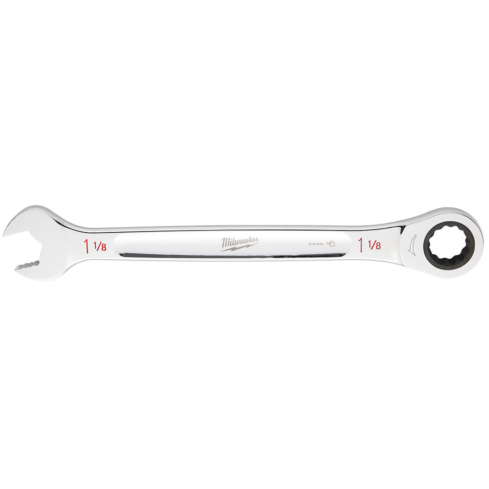 The SAE Ratcheting Combination Wrenches feature 2.5 degrees of arc swing and 144 ratcheting positions, allowing quick and efficient work in tight spaces. This wrench has double-stacked pawls within the ratcheting mechanism, which increases durability and extends the life of the tool. The MAXBITE™ Open-End Grip improves the wrench's grip on nuts and bolts, offering 25% more torque than smooth-faced wrenches. The combination wrench features an ergonomic I-Beam handle design for improved comfort and ink-filled size labels for easy size identification and quick distinction between SAE and metric sets. The MILWAUKEE® SAE wrench sizes range from 1/4" to 1" and feature a Lifetime Guarantee.