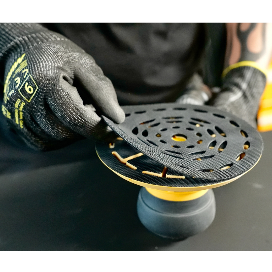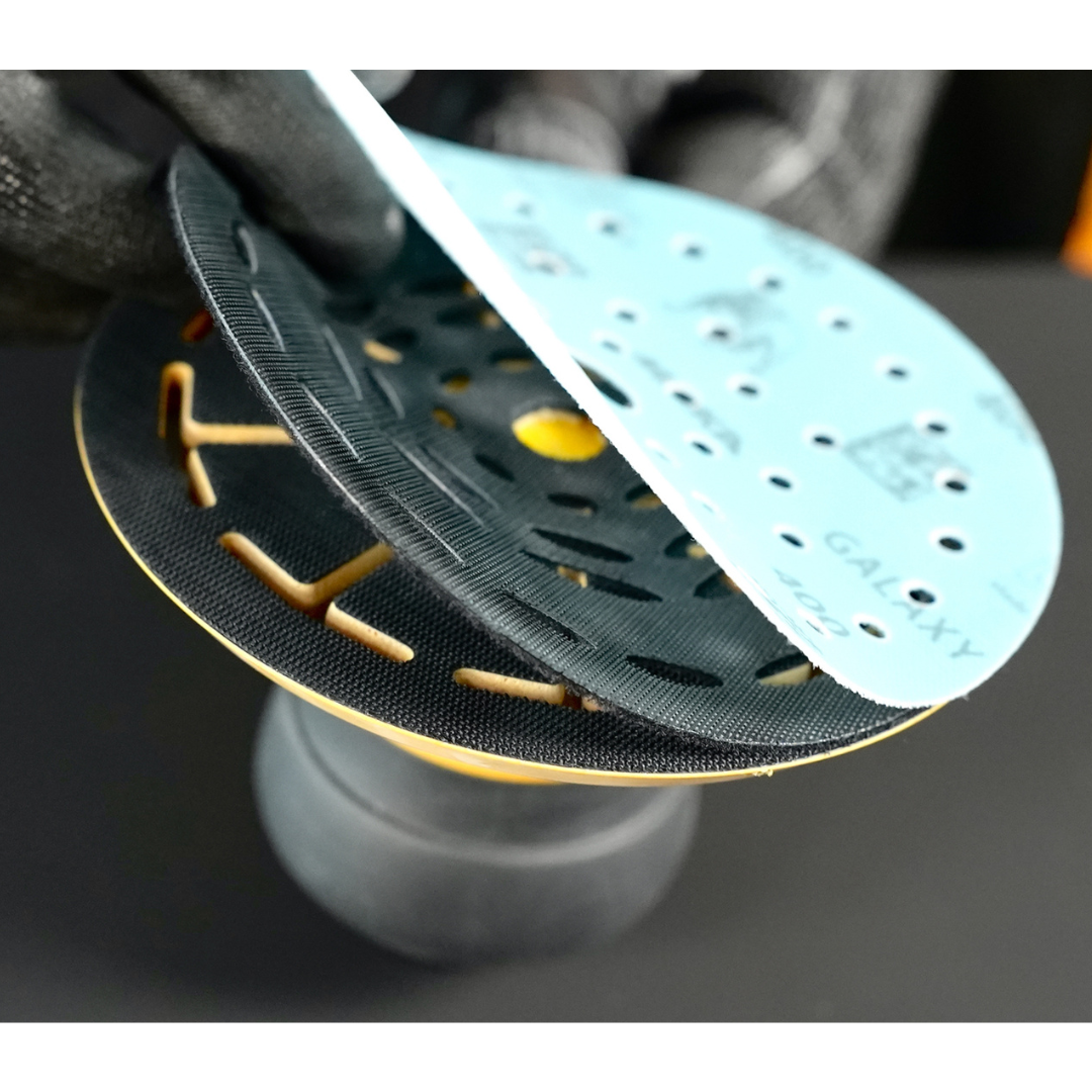 Le taux d'enlèvement de matière élevé du Galaxy génère plus de poussière que des disques comme le Gold, ce qui contribue à donner l'impression que le disque et le plateau de support doivent être alignés. Le nouveau plateau de support Multifit offre une aspiration de poussière encore plus performante, optimisée pour les disques Galaxy Multifit, notamment pour le ponçage des apprêts.