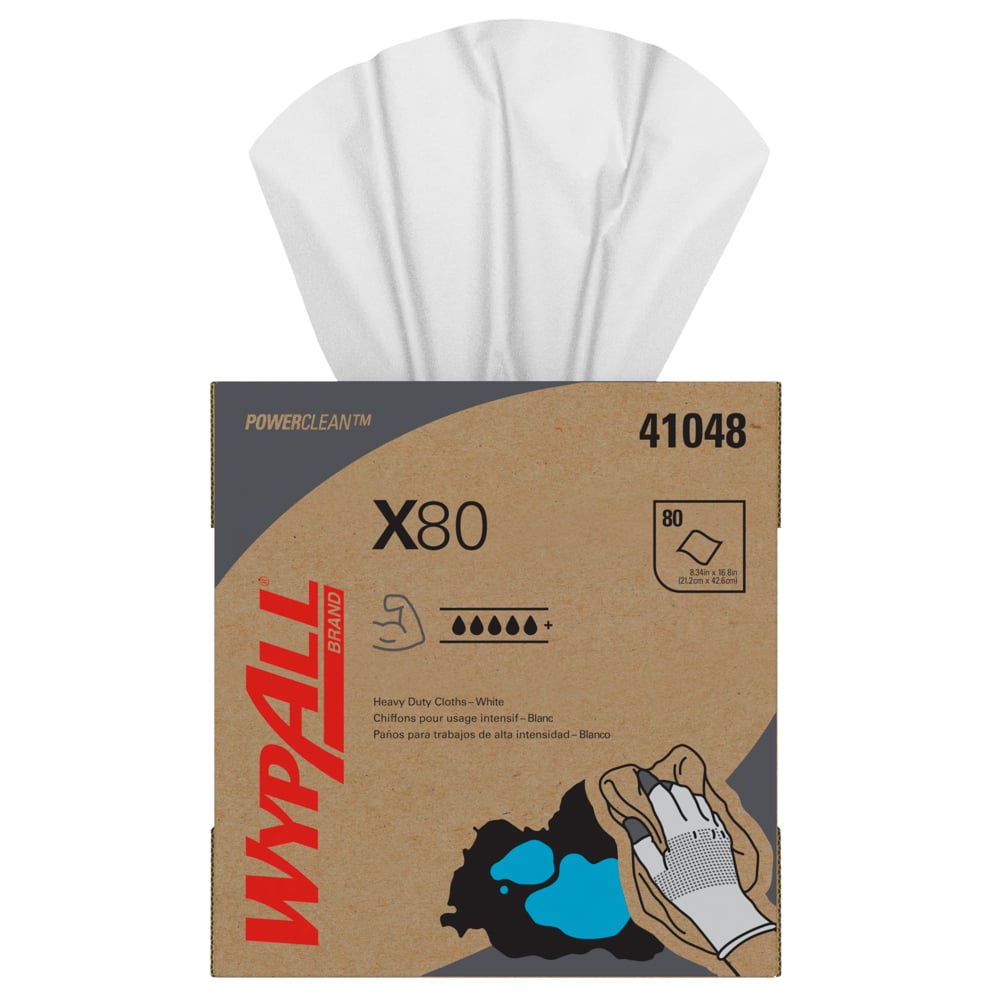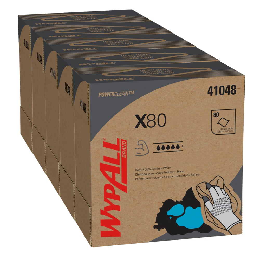 - 80 feuilles/paquet ; 5 paquets de chiffons WypAll® PowerClean™ X80 pour travaux lourds/caisse ; 400 feuilles/caisse ; blanc ; boîte pop-up ; serviettes à usage prolongé