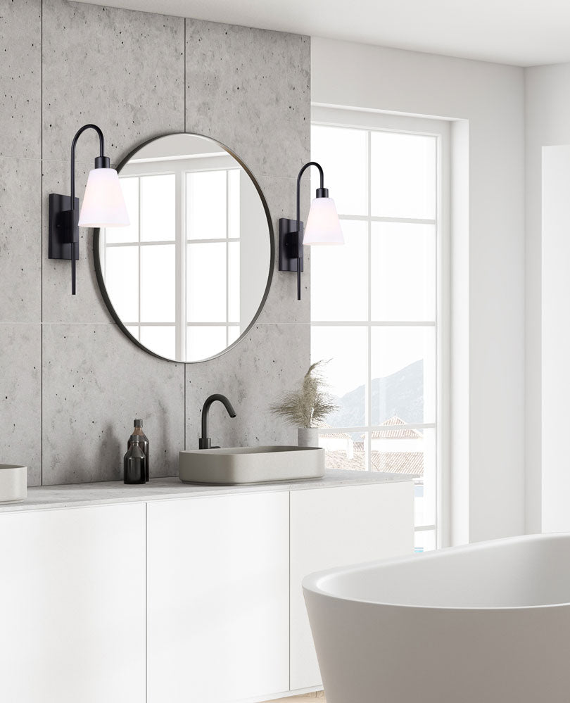Insufflez une nouvelle vie à l'éclairage de votre salle de bain avec un look de ferme / transitionnel moderne et épuré et beaucoup de lumière. Avec une plaque arrière rectangulaire, des bras incurvés, une finition noire mate et un verre opale plat, la silhouette étonnante et l'allure simple de WYLER donneront chaleur et caractère à votre salle de bain et au décor environnant.