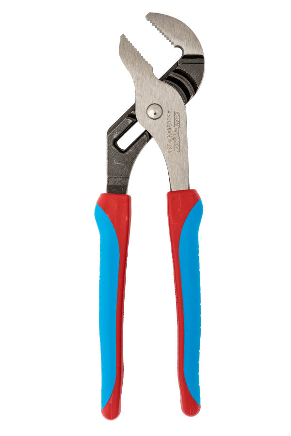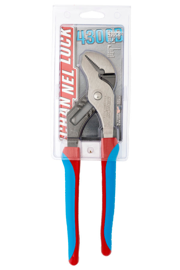 Les pinces à rainure et languette à mâchoires droites CHANNELLOCK® sont conçues pour durer avec une fixation PERMALOCK® pour éliminer la défaillance des écrous et des boulons, un bord de renforcement breveté pour minimiser la rupture par contrainte et des dents durcies au laser pour offrir une meilleure prise plus durable. Les pinces à rainure et languette à mâchoires droites CHANNELLOCK® sont fabriquées aux États-Unis et forgées à partir d'acier américain à haute teneur en carbone spécialement revêtu pour une prévention ultime de la rouille. Les pinces à rainure et languette 430CB de 10 pouces sont dotées de poignées confortables CODE BLUE®.