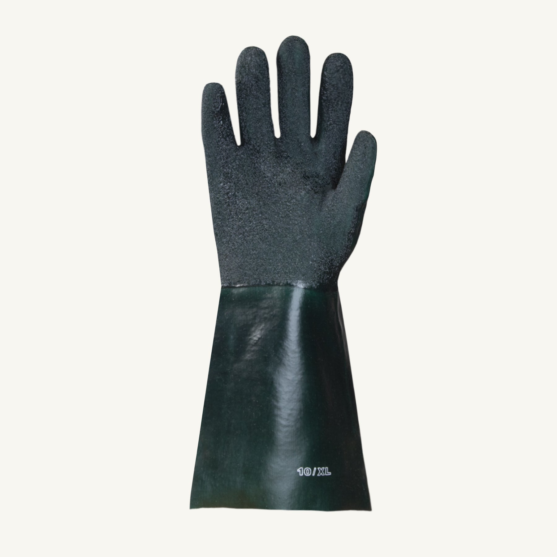 Gants chimiques en PVC avec poignets allongés et paumes à finition rugueuse pour une meilleure adhérence.