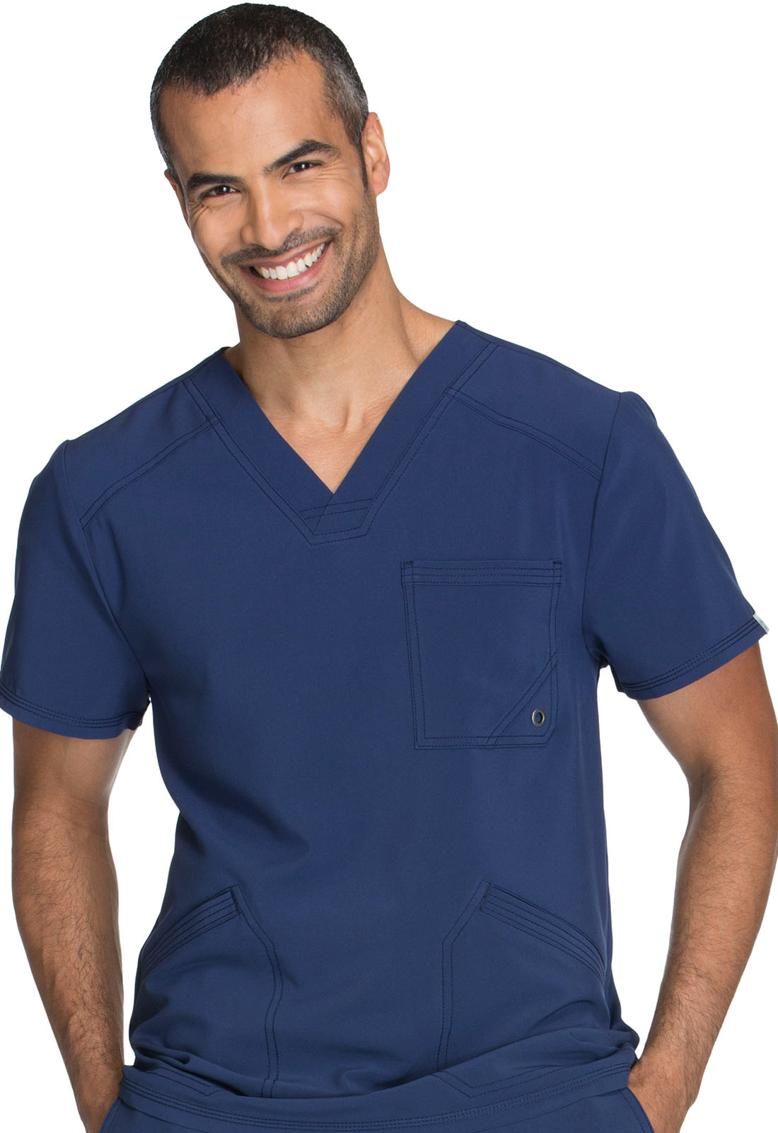 Un haut à col en V de coupe moderne pour homme comprend une poche poitrine avec œillets, des poches avant passepoilées avec des surpiqûres triples, des empiècements avant et arrière et des panneaux arrière en tricot côtelé extensible pour plus de confort. Longueur au centre du dos : 29 1/2". Le tissu en popeline extensible confortable et le tricot côtelé super extensible sont la combinaison parfaite pour les professionnels de la santé.