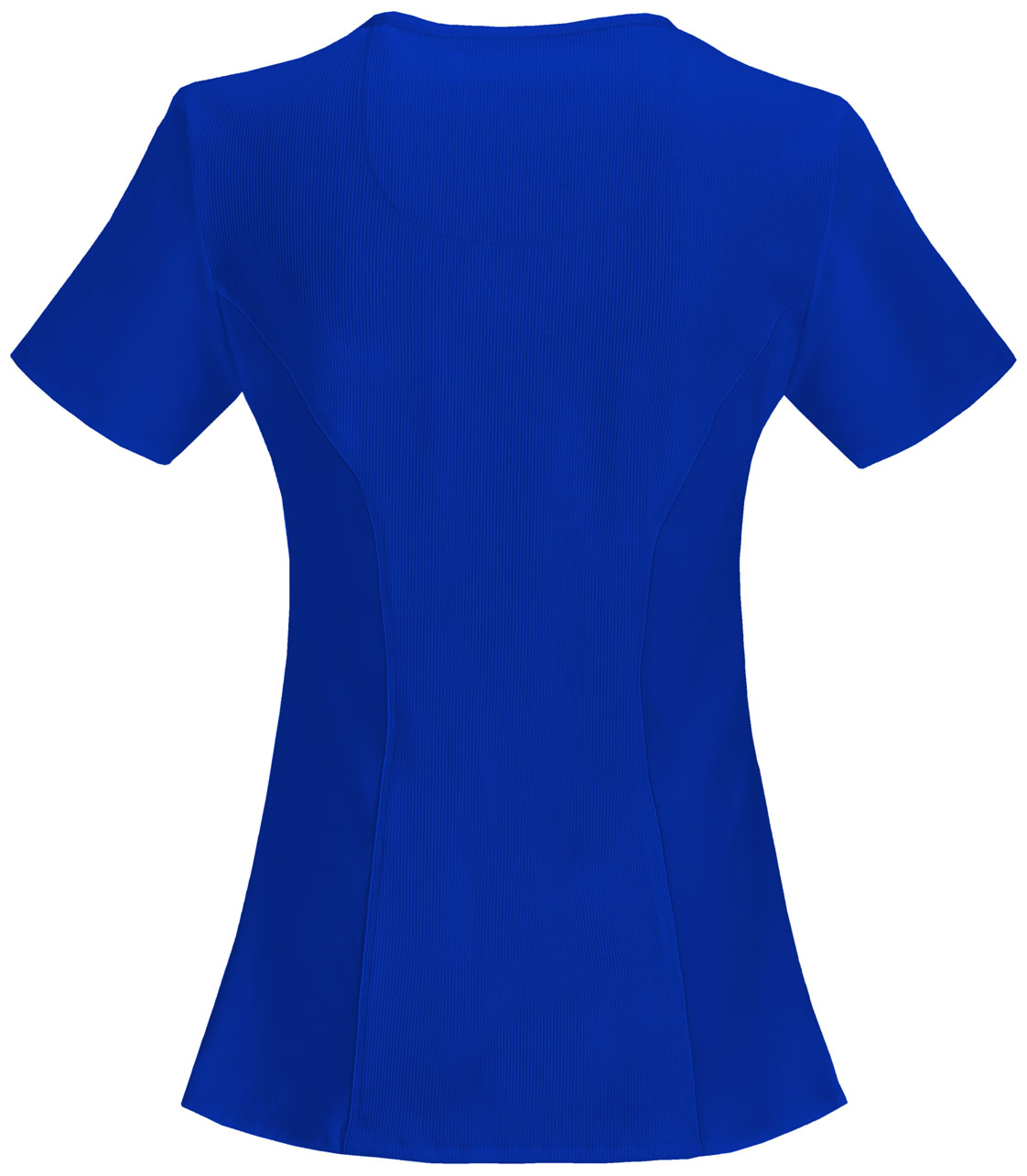 Un haut cache-cœur de coupe contemporaine comprend deux poches avant intégrées, un joint torique avec logo au-dessus de la poche gauche, une poche ciseaux gauche, une poche intérieure, des coutures princesse à l'avant et à l'arrière et des fentes latérales. Le tricot côtelé extensible au centre du panneau arrière donne à ce haut sa forme amincissante et permet plus de mouvement et de confort. Longueur au centre du dos : 26". Le tissu en popeline extensible confortable et le tricot côtelé super extensible sont la combinaison parfaite pour les professionnels de la santé.