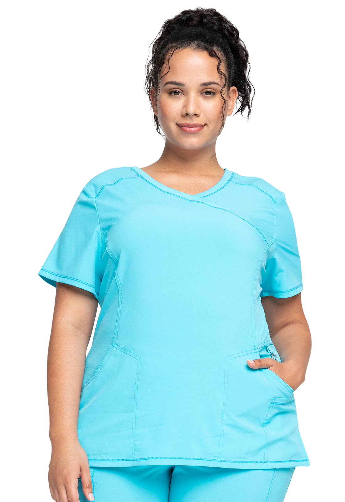 Un haut cache-cœur de coupe contemporaine comprend deux poches avant intégrées, un joint torique avec logo au-dessus de la poche gauche, une poche ciseaux gauche, une poche intérieure, des coutures princesse à l'avant et à l'arrière et des fentes latérales. Le tricot côtelé extensible au centre du panneau arrière donne à ce haut sa forme amincissante et permet plus de mouvement et de confort. Longueur au centre du dos : 26". Le tissu en popeline extensible confortable et le tricot côtelé super extensible sont la combinaison parfaite pour les professionnels de la santé.
