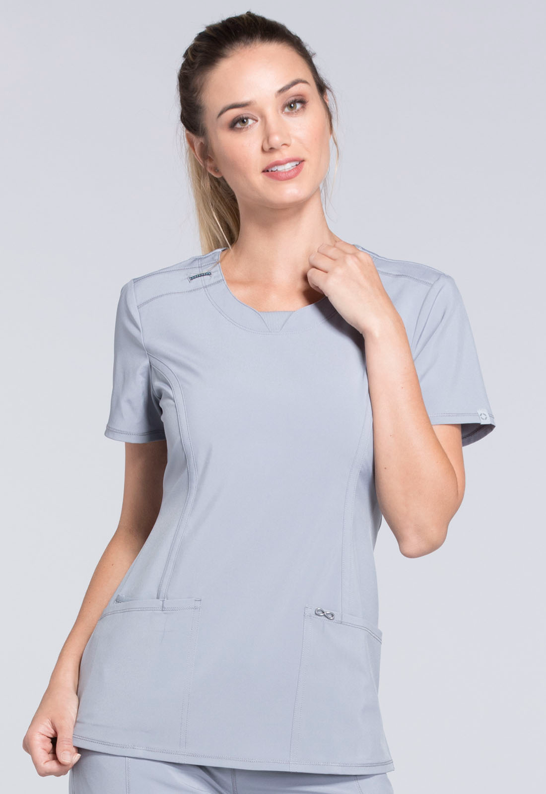 Un haut à col rond de coupe contemporaine avec un empiècement en tricot côtelé sur le tour de cou avant comprend également des empiècements aux épaules, une boucle élastique pour badge d'identification sur l'épaule droite, des coutures princesse à l'avant et à l'arrière, deux poches plaquées, une poche intérieure et des fentes latérales. Le tricot côtelé extensible au centre du panneau arrière donne à ce haut sa forme amincissante et permet plus de mouvement et de confort. Détail de points de recouvrement sur l'ensemble. Longueur au centre du dos : 26". Le tissu en popeline extensible confortable et le tricot côtelé super extensible sont la combinaison parfaite pour les professionnels de la santé.