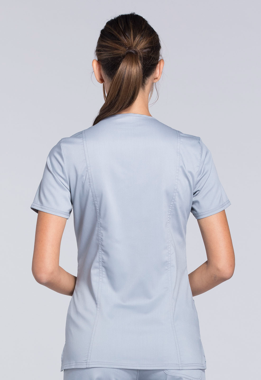 Un haut cache-cœur de coupe classique moderne comprend des empiècements aux épaules sur le devant, deux poches plaquées, une boucle pour instrument, une étiquette logo avec boucle élastique, des coutures princesse à l'avant et à l'arrière et des fentes latérales. Longueur au milieu du dos : 26"