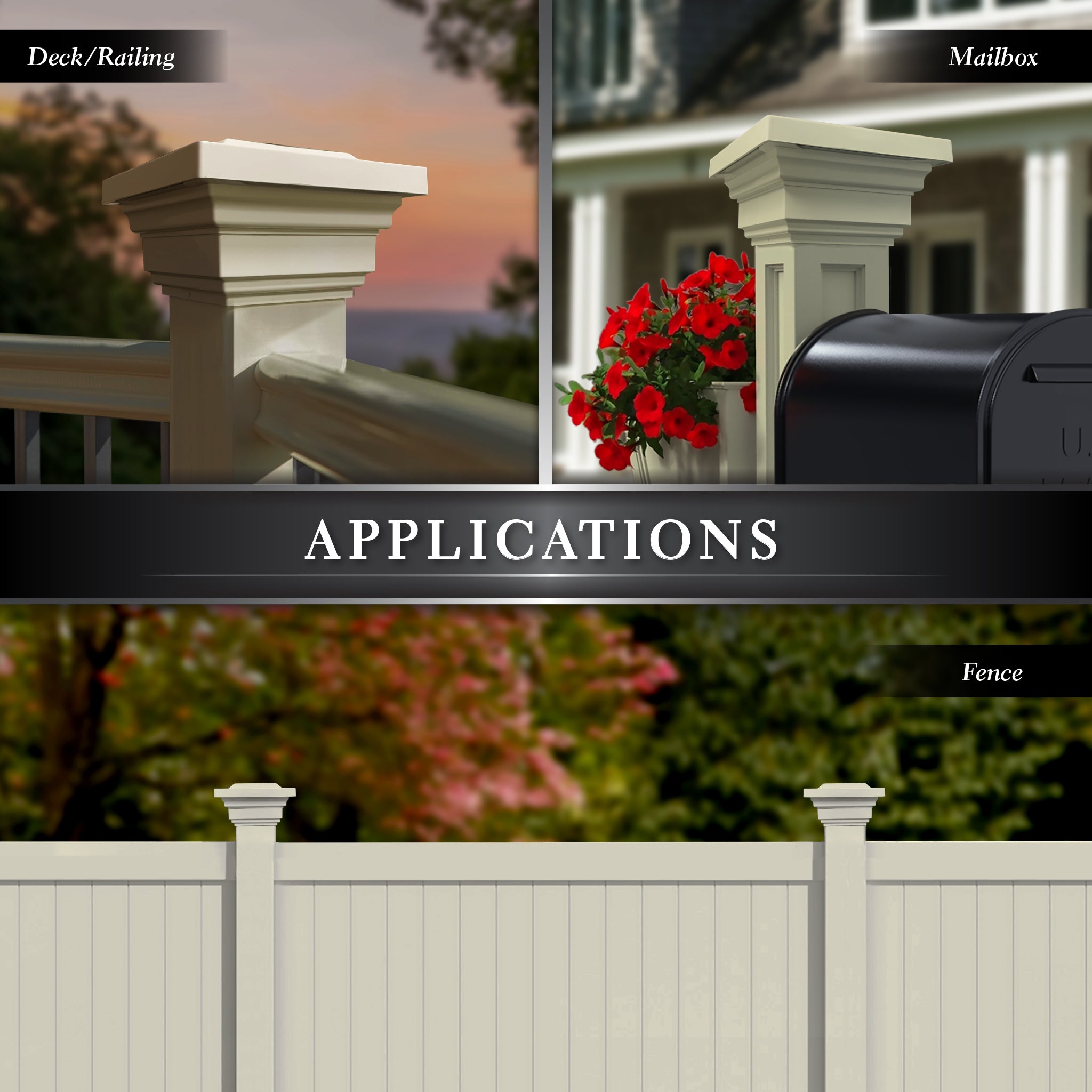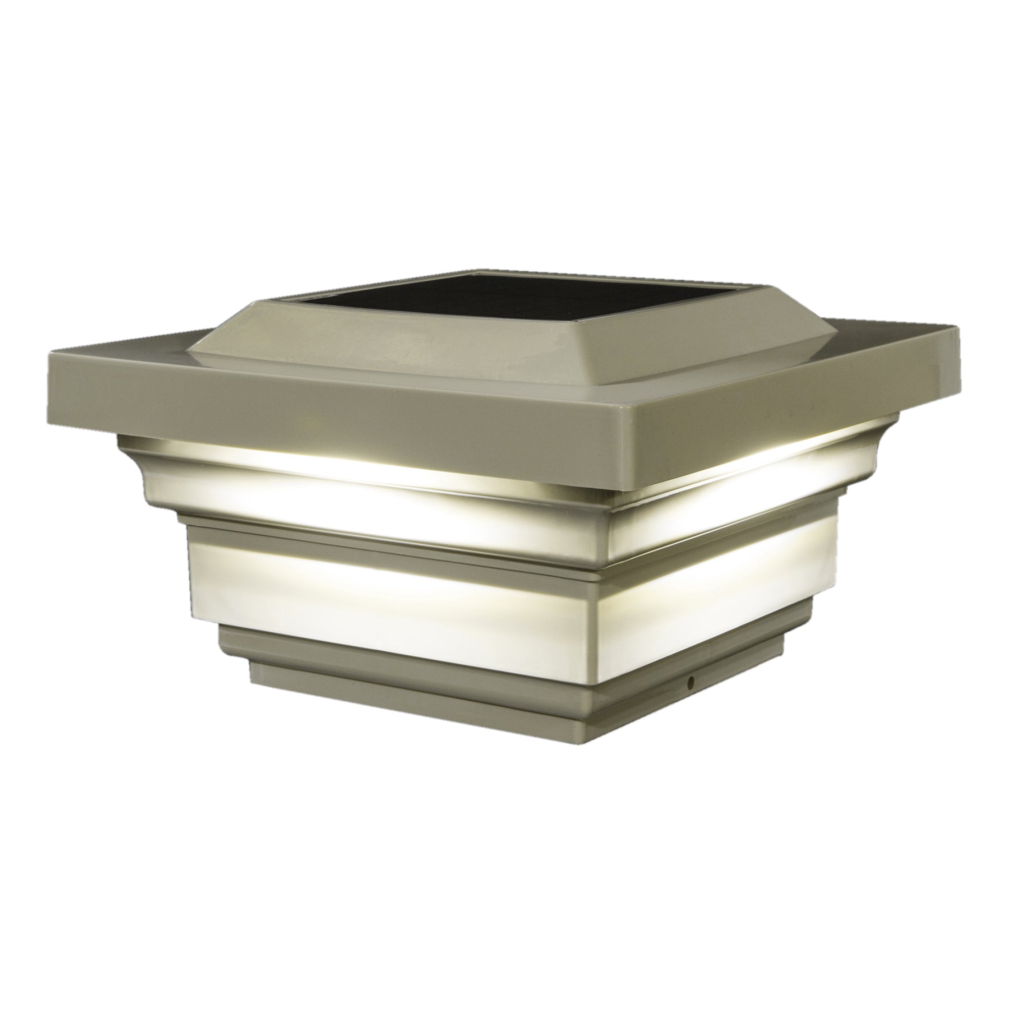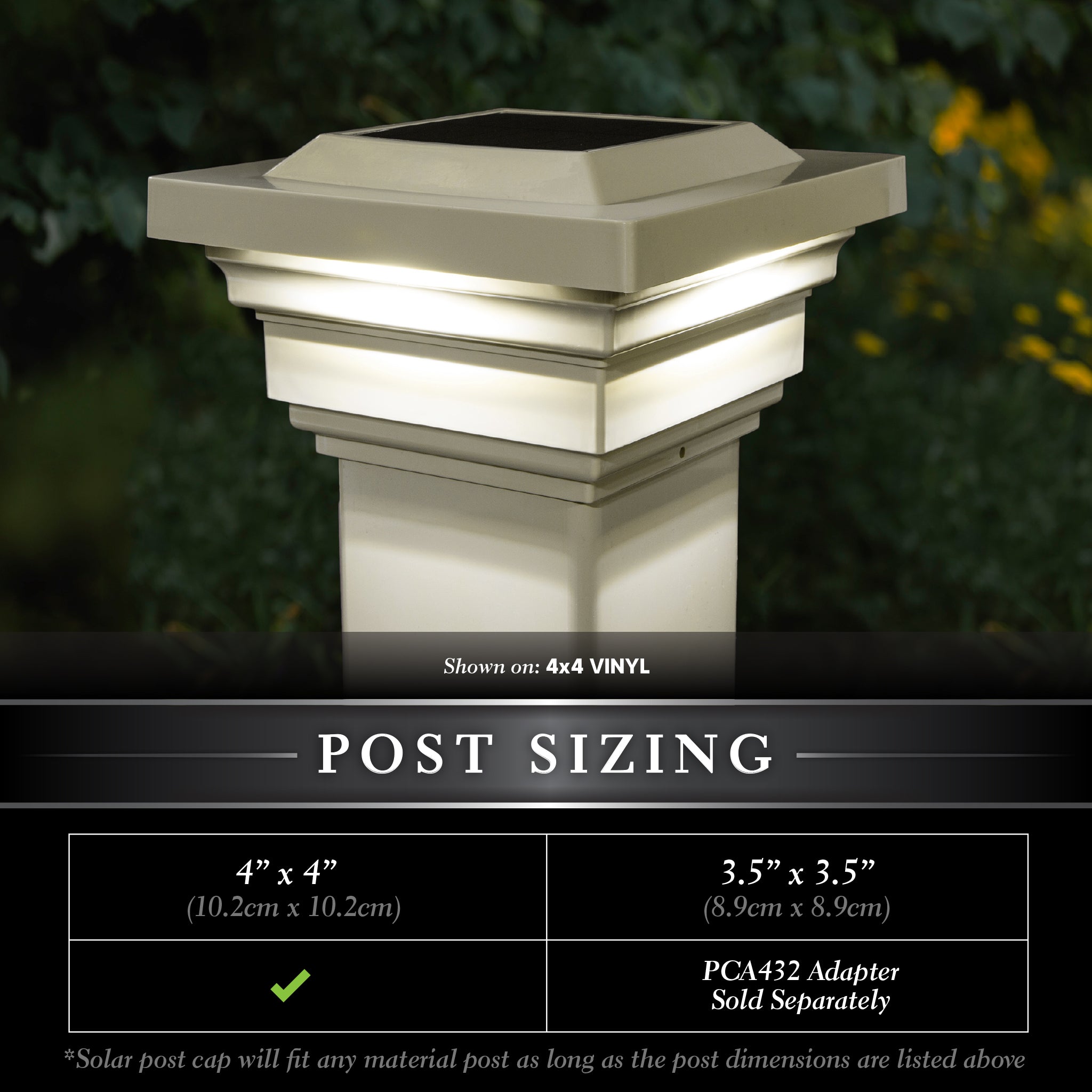 Le design attrayant et discret du capuchon de poteau solaire Classy Caps Regal ajoutera beauté et élégance à votre terrasse, clôture ou jardin. Quatre LED à montage en surface projettent une lumière blanche brillante vers le bas sur le poteau et ses environs pendant 12 heures maximum. La construction en PVC durable de haute qualité ne se décolore pas, ne se fissure pas et ne jaunit pas. S'installe facilement sur un véritable poteau de 4"x4" avec les vis de montage incluses. Trois fois plus lumineux que les LED standards.
