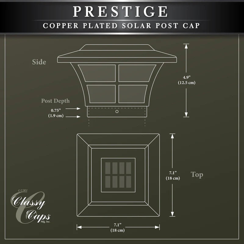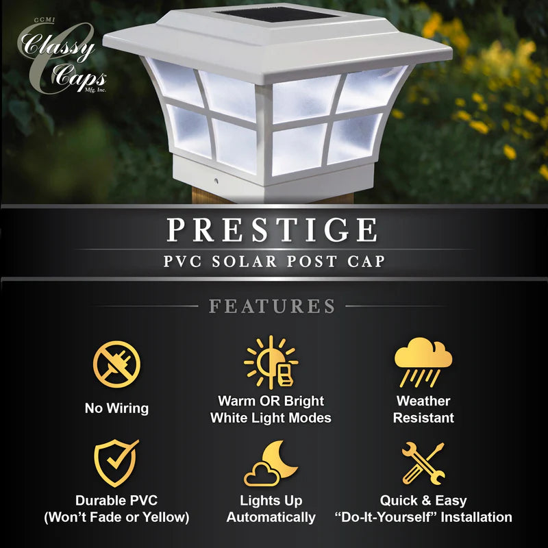 Le design attrayant et traditionnel breveté du capuchon de poteau solaire original Classy ajoutera de l'éclat et de l'attrait à votre clôture ou terrasse. Fabriqué à l'aide de quatre LED à montage en surface à haut rendement qui projetteront une lumière blanche brillante vers le bas sur les murs extérieurs du capuchon de poteau et la zone environnante, créant une ambiance unique. Conçu pour fournir jusqu'à 12 heures de lumière automatiquement chaque nuit. S'adapte sur un véritable poteau de 4" x 4".