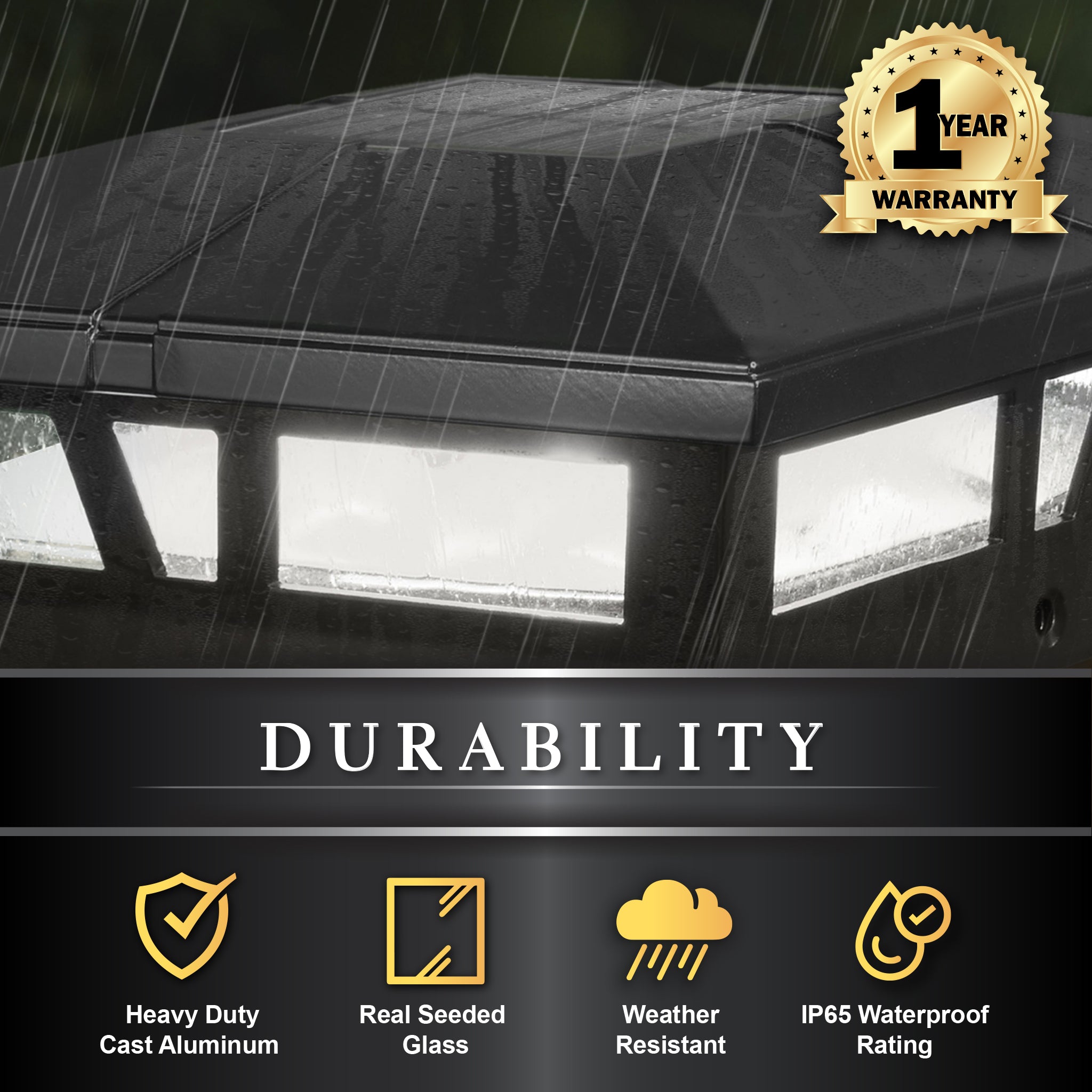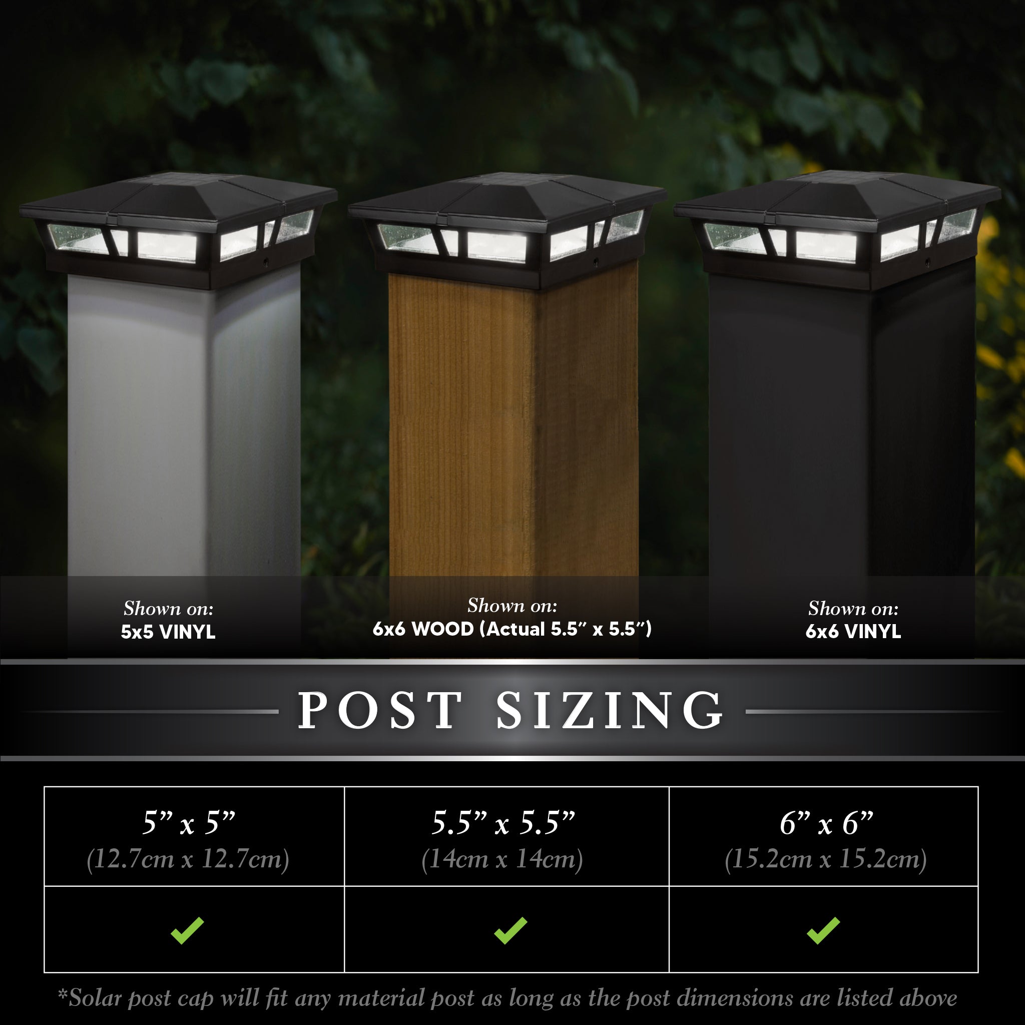 Le séduisant capuchon de poteau solaire Cambridge à profil bas est fabriqué à partir d'aluminium moulé robuste et résistant aux intempéries avec une finition en poudre durable. Doté d'une lentille en verre véritable et de deux LED à montage en surface à haut rendement. Le Cambridge de 6" x 6" projettera une riche lumière ambiante qui s'allumera automatiquement au crépuscule, créant un paysage pittoresque pour votre clôture, porche ou terrasse. Un autre design supérieur de Classy Caps. S’adapte sur un véritable poteau de 6"x6" ou 5,5"x5,5".