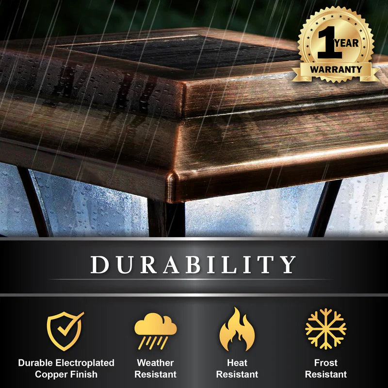 Le capuchon de poteau solaire Prestige plaqué cuivre 6x6 est élégant et durable avec des performances sur lesquelles vous pouvez compter. Fini dans un riche cuivre électrolytique antique. Notre conception brevetée du cadre de fenêtre et notre lentille givrée créent une ambiance unique. S'adapte sur un poteau réel de 5,5" x 5,5" (diamètre intérieur de la base 5-5/8" x 5-5/8")