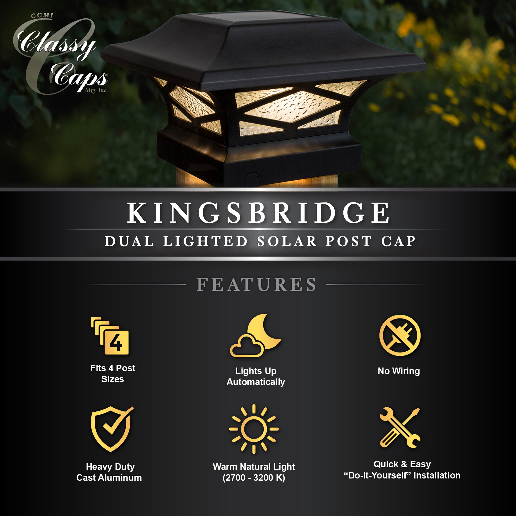 Présentation du capuchon de poteau solaire à double éclairage Kingsbridge, conçu et fabriqué exclusivement par Classy Caps Mfg. Inc. Ce capuchon de poteau solaire unique en son genre est une conception brevetée unique avec la polyvalence nécessaire pour s'adapter à plus de quatre poteaux de taille standard. Le Kingsbridge en fonte d'aluminium respire la qualité, offrant un panneau solaire monocristallin et une batterie rechargeable LifeP04 de 3,2 V pour de nombreuses années de fiabilité sans entretien. La lentille en verre véritable et les LED à montage en surface stratégiquement placées projetteront de magnifiques accents d'éclairage chaleureux pour mettre en valeur votre clôture, votre terrasse, votre paysage et plus encore. Vos voisins envieront certainement le capuchon de poteau solaire à double éclairage Kingsbridge qui est vraiment digne d'un roi !