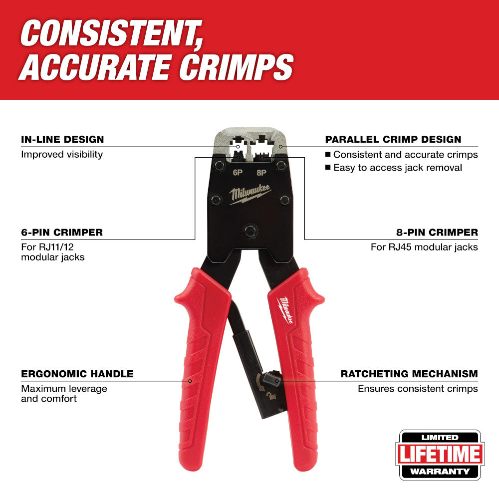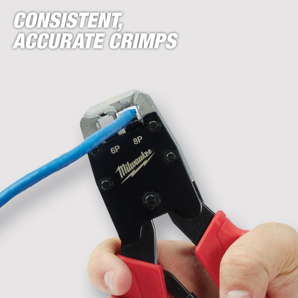 La pince à sertir modulaire à cliquet est conçue pour l'installation de connecteurs modulaires RJ11 et RJ45 et offre un sertissage constant et précis. Sa conception unique permet d'appliquer une force uniforme lors du sertissage, tandis que sa tête en ligne offre une meilleure visibilité et un accès facile pour le retrait des connecteurs.