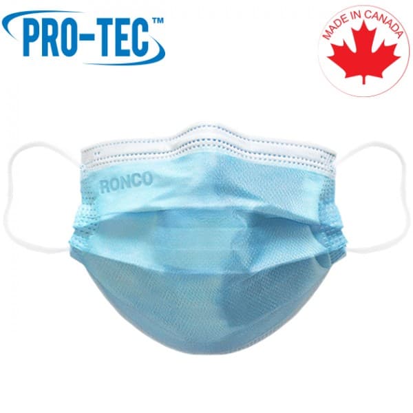 Masques plissés à 3 couches, ASTM niveau 2, fabriqués avec un matériau filtrant soufflé par fusion de la plus haute qualité, les masques Pro-Tec 5622V sont fabriqués dans l'usine de RONCO en Ontario, Canada. La machine 100% automatisée (y compris l'emballage) garantit que les masques ne sont jamais touchés par des mains humaines.