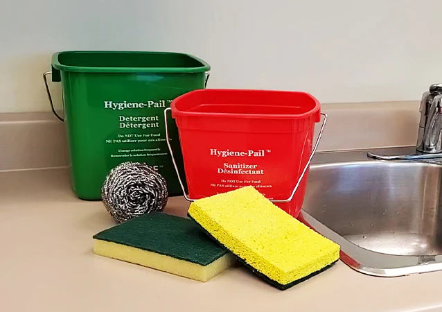 Hygiene–Pail® répond aux directives HACCP en tant que conteneurs étiquetés à usage dédié pour les solutions de nettoyage et de désinfection. Le code couleur permet de minimiser toute confusion potentielle entre les solutions de nettoyage et de désinfection pour vos chiffons de nettoyage. Utilisez des Hygiene-Pails® verts pour les solutions de nettoyage et des Hygiene-Pails® rouges pour les solutions désinfectantes. Les seaux sont disponibles en tailles 3Qt et 6Qt pour les applications à l'avant et à l'arrière de la maison.