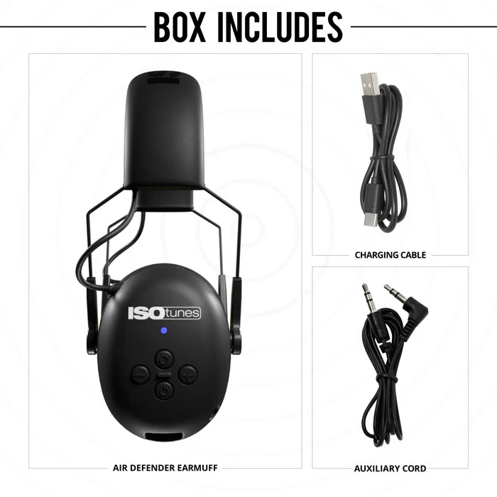 ISOtunes AIR DEFENDER est livré avec un câble d'entrée auxiliaire et un câble de chargement micro USB.