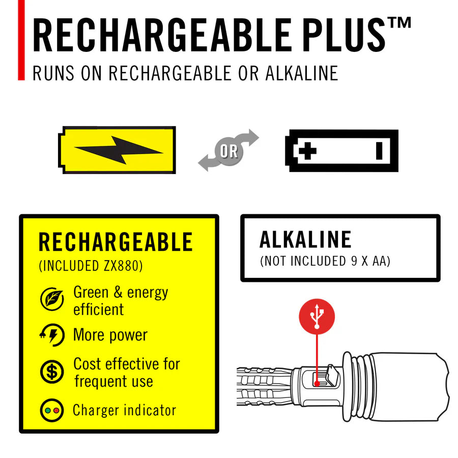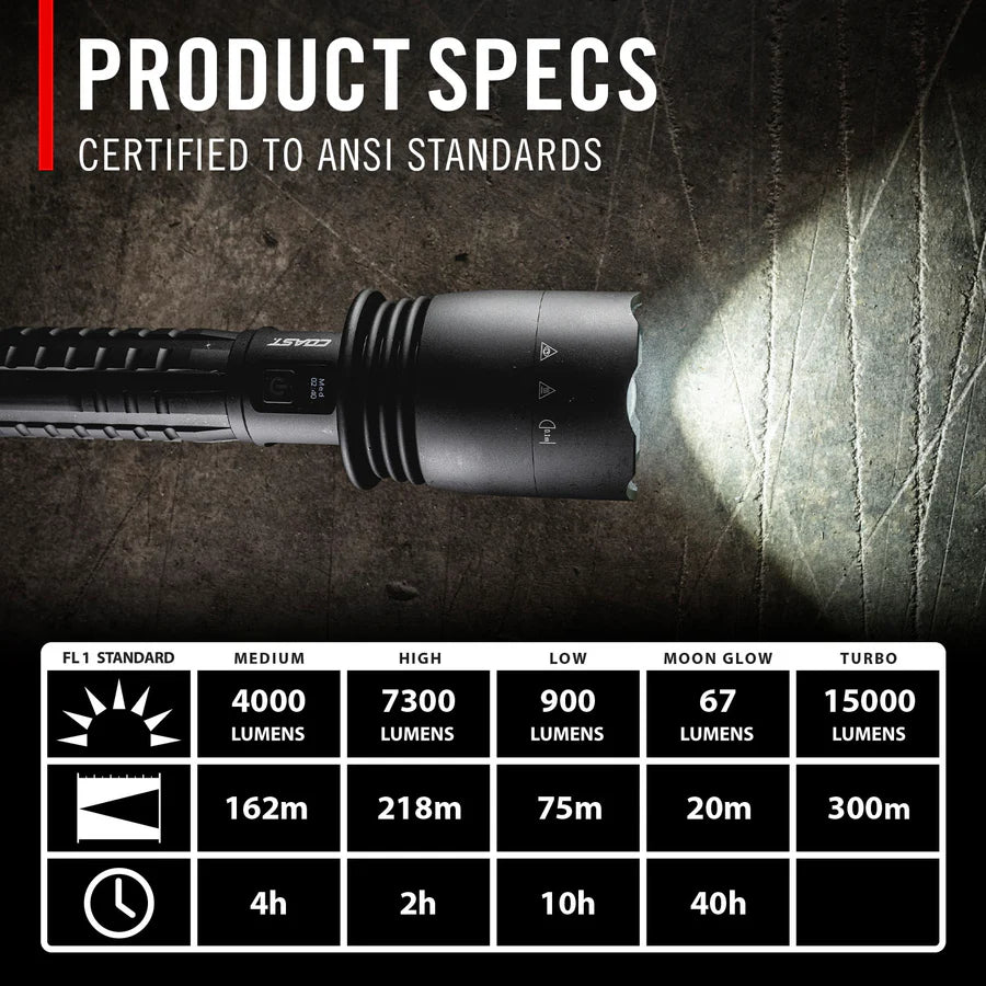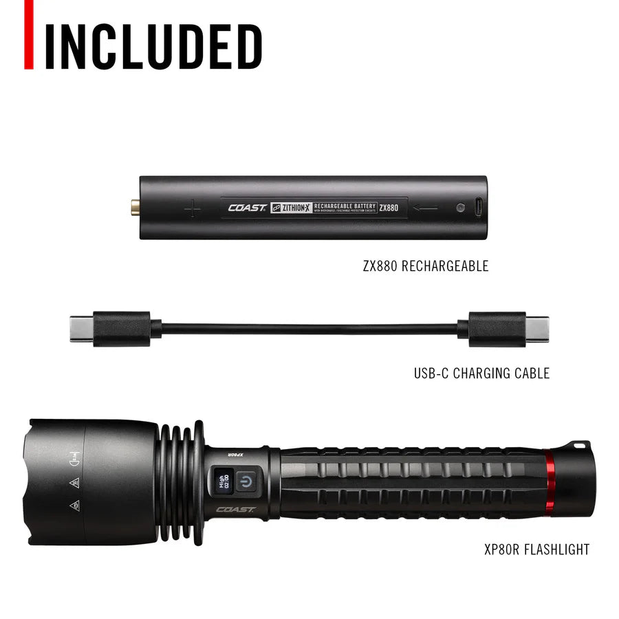 Portez la lumière à un tout autre niveau. Conçu pour une luminosité maximale Avec sa puissance de sortie de 15 000 lumens, la lampe torche rechargeable XP80R offre un éclairage portable de haute qualité. Elle est dotée de cinq modes : moyen, fort, faible, Turbo. MoonGlow ™ — dispose d'une fonction de mise au point Pur Le faisceau s'ajuste facilement en poussant ou en tirant le SLIDE FOCUS ® . Pendant l'utilisation, L'affichage en temps réel POWERiQ ™ devant l'interrupteur d'alimentation indique dans quel mode la lampe de poche est allumée en fonctionnement et combien de temps d'exécution restes Dans la batterie. Pour gérer sa puissance impressionnante, la XP80R est dotée d'une protection intégrée contre la surchauffe qui réduit automatiquement la puissance si le circuit atteint un seuil de température. Dotée d'un port de charge Pro-Tek à l'avant de la poignée, cette lampe torche Rechargeable Plus se recharge pendant que sa batterie ZITHION-X™ ZX880 (incluse) restes à l'intérieur. Branchez-le directement sur le port USB-C et moniteur Indicateur de charge. Un port USB-C séparé sur la poignée permet de recharger d'autres appareils en utilisant la lampe comme batterie externe. La lampe peut également fonctionner avec neuf piles alcalines AA ( vendues séparément ). séparément). Activez le verrouillage de l'alimentation lorsque la lampe de poche n'est pas Utilisé pour éviter toute décharge accidentelle de la batterie. Fabriqué avec des matériaux de première qualité et adapté aux travaux les plus exigeants, le XP80R est certifié IP54 pour sa résistance à la poussière et à l'eau et bénéficie de la garantie à vie COAST.