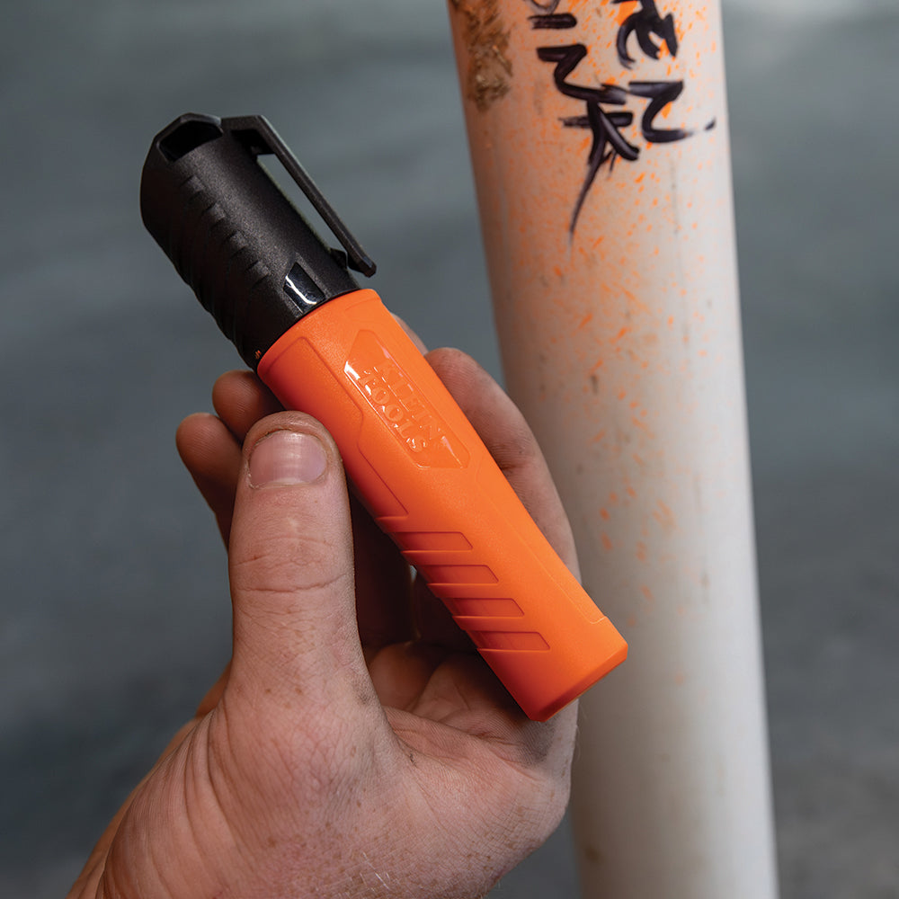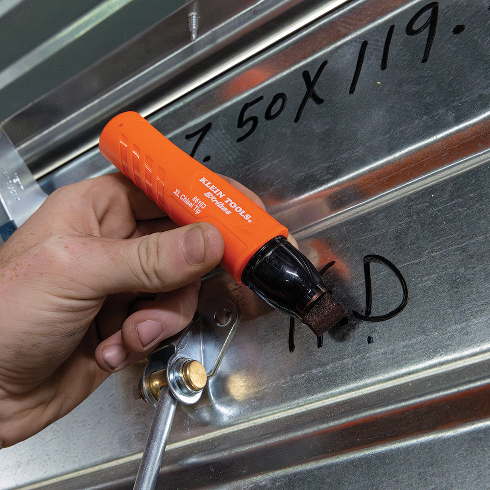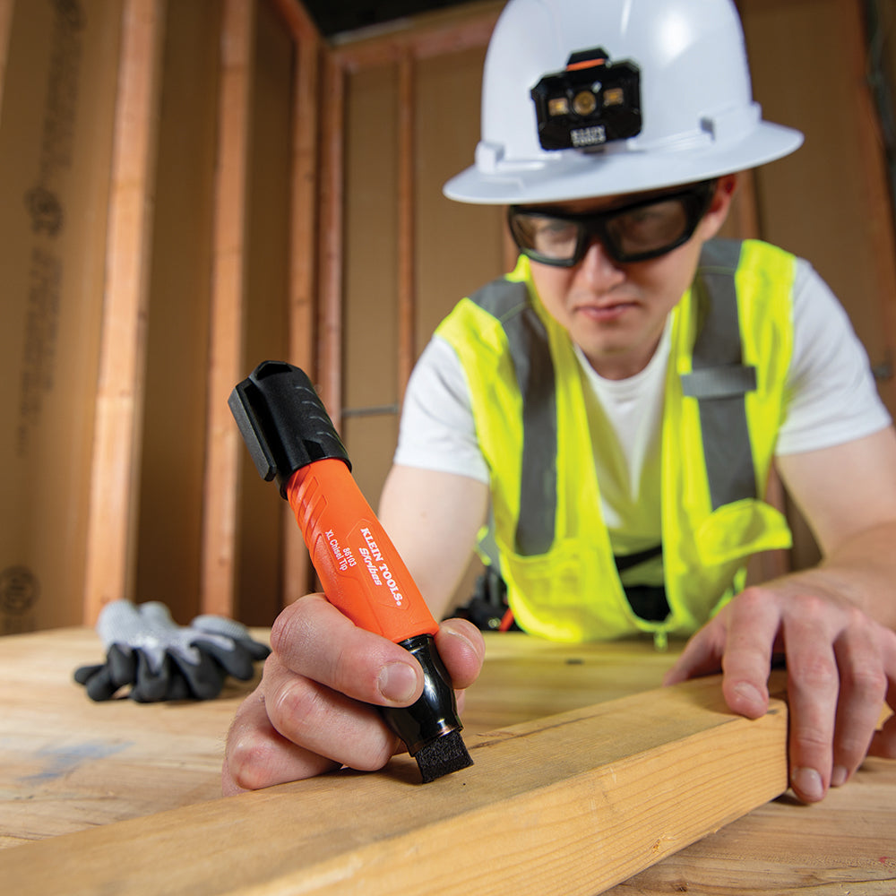 Le marqueur permanent noir à pointe biseautée Klein Tools Skribes™ XL est conçu pour les conditions de chantier difficiles. Doté d'une pointe biseautée épaisse et résistante, il trace des lignes extra-larges et durables pour le marquage et l'étiquetage. Son encre de qualité professionnelle écrit sans effort sur les surfaces humides, sèches, huileuses et abrasives, et résiste à l'encrassement pour un marquage fluide. Sa durée de vie prolongée de 72 heures sans capuchon empêche le marqueur de sécher rapidement. Sa forme triangulaire anti-roulement et son clip intégré pour casque de sécurité le rendent facilement accessible sur le chantier.