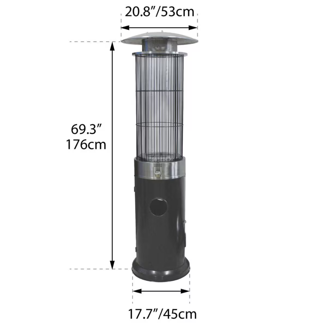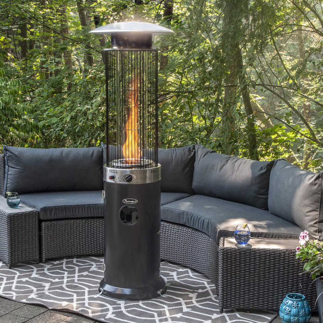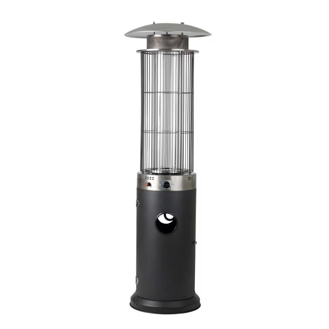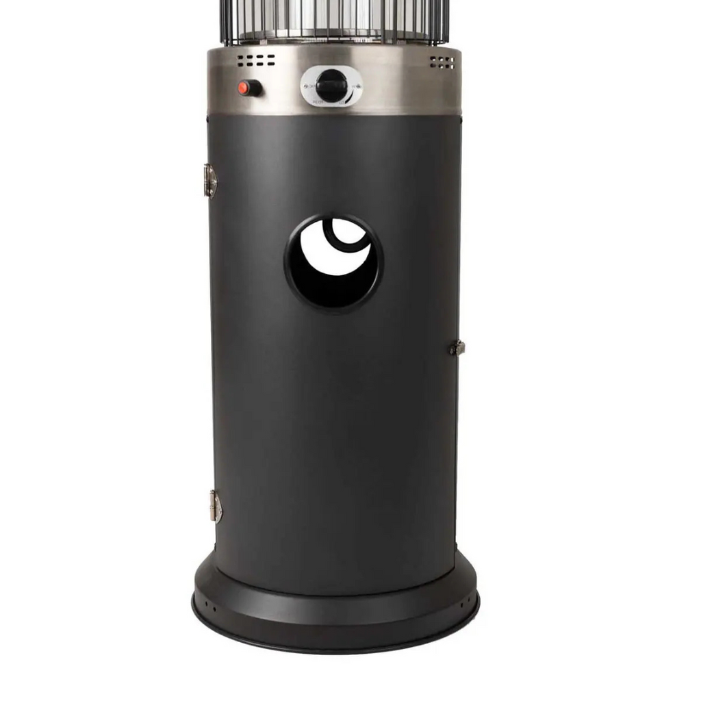 L'appareil est équipé de roulettes pour un déplacement facile sur votre terrasse. Il est équipé d'une protection anti-basculement qui éteint la flamme en cas de basculement. Une bouteille de propane standard de 9 kg (non incluse) se loge facilement dans la base et offre jusqu'à 10 heures de chaleur par bouteille.
