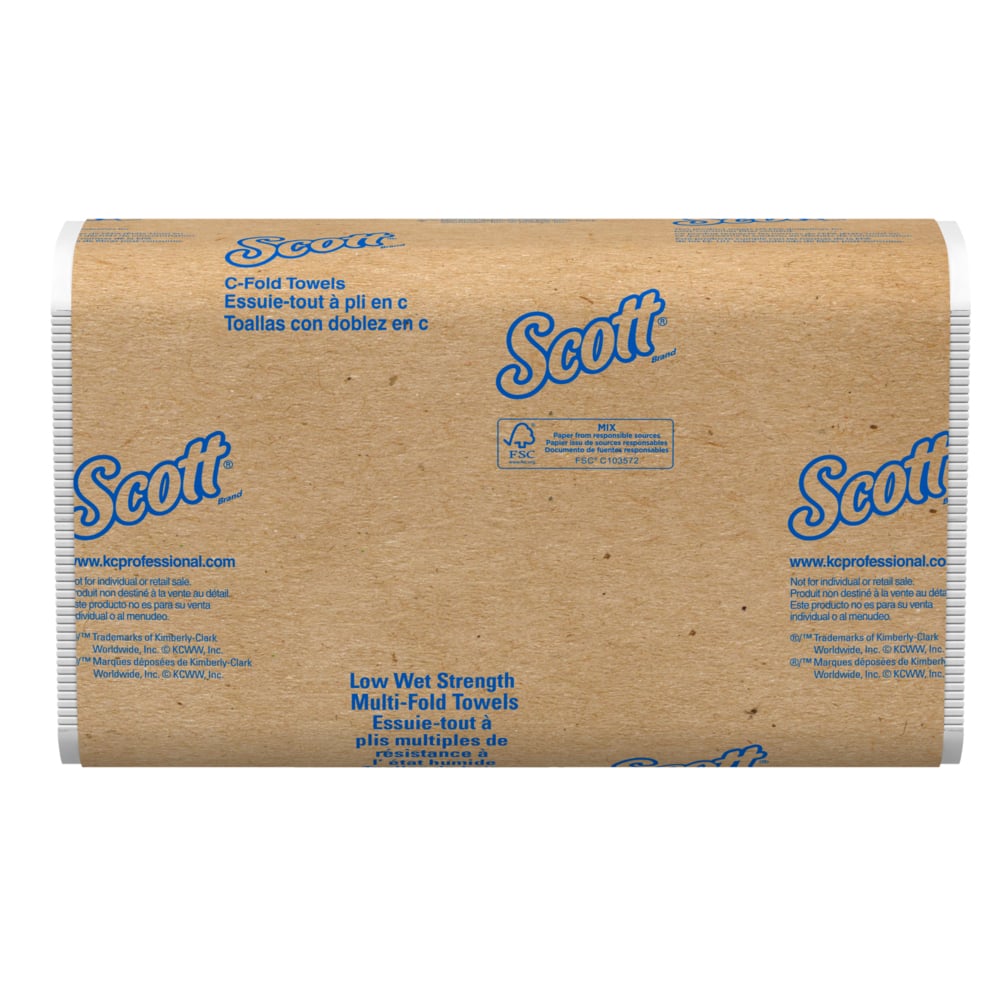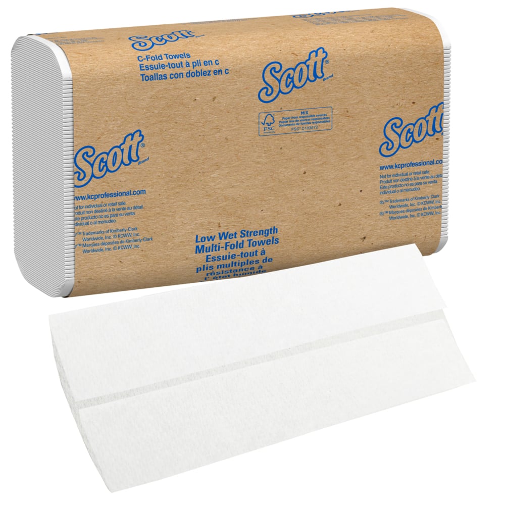 - 200 feuilles/paquet, 12 paquets d'essuie-tout Scott® Essential pliés en C/caisse, 2 400 feuilles/caisse ; faible résistance à l'humidité ; blanc ;