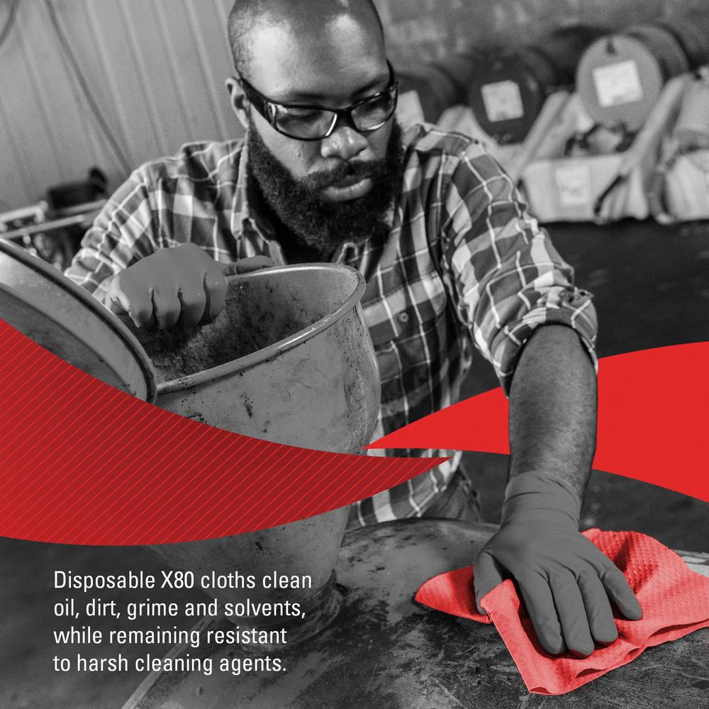 WypAll® est la marque numéro un de lingettes jetables aux États-Unis et au Canada. Maximisez les performances tout en minimisant le temps, les efforts et le gaspillage de produits. Les chiffons WypAll® PowerClean™ X80 Heavy Duty présentent des innovations telles que le matériau haute technologie à absorption rapide Hydroknit® et sont durables pour le nettoyage. Ces chiffons commerciaux sans contaminants sont un substitut préféré aux serviettes en tissu industrielles, qui peuvent contenir des produits chimiques dangereux, tels que le plomb (dans une étude de 2003 de Gradient, 100 % des serviettes d'atelier lavées échantillonnées testées, le plomb a été détecté à des niveaux pouvant dépasser les directives d'exposition basées sur la santé.). Les chiffons WypAll® PowerClean™ X80 Heavy Duty sont fabriqués à partir de fibres de pulpe douces, liées à une feuille de base en polypropylène pour plus d'absorption et de durabilité, ce qui les rend adaptés à l'élimination de la saleté, de l'huile, de la crasse et des solvants dans les entreprises industrielles et de fabrication. Les chiffons réutilisables sont renforcés pour plus de résistance lorsqu'ils sont mouillés et secs. Ces chiffons en vrac sont une excellente alternative - plus sûre et plus efficace - pour remplacer les serviettes d'atelier de location lavées ou les serviettes de nettoyage. Utilisez-les pour essuyer les pièces et les machines en profondeur, essuyer les copeaux métalliques, préparer les surfaces avec des solvants et nettoyer les surfaces rugueuses. Après tout, chaque entreprise se salit. Mais pour la graisse et la saleté les plus tenaces, vous pouvez faire confiance aux chiffons WypAll® PowerClean™ X80 Heavy Duty.