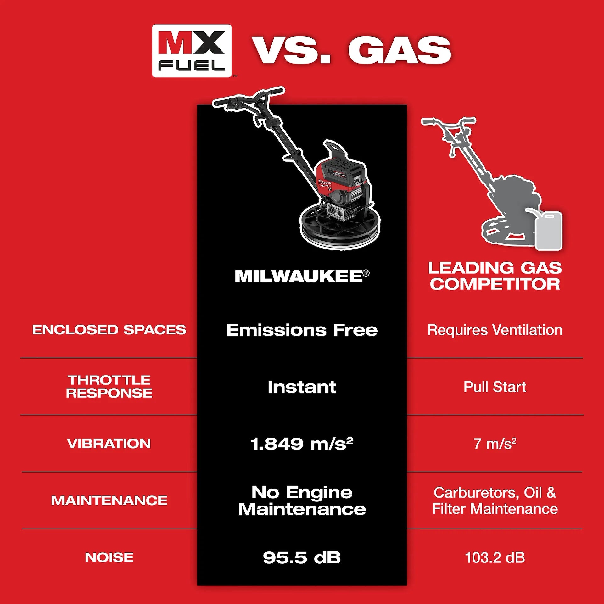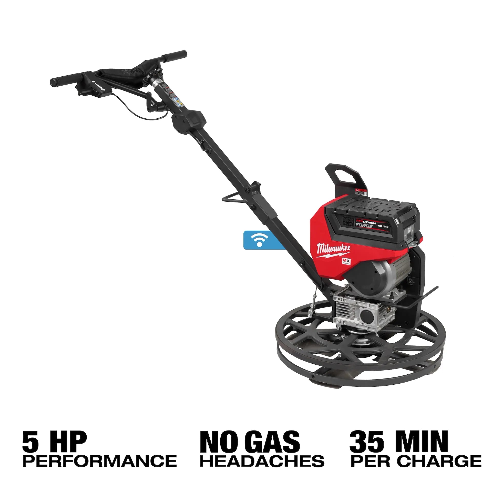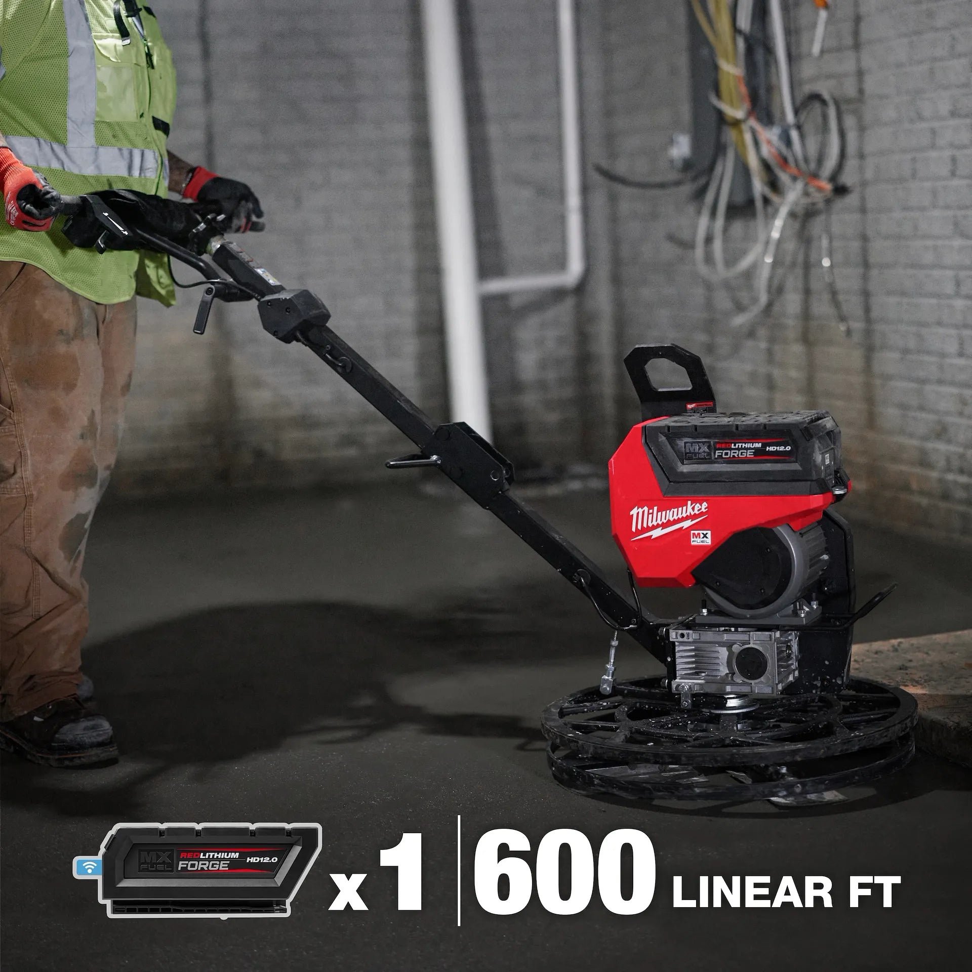 La truelle à bordures à conducteur porté MX FUEL™ 24 pouces offre une finition douce et équilibrée grâce à sa puissance de 5 CV, sans soucis de carburant et à son autonomie de 35 minutes par charge. Le moteur sans balais POWERSTATE™ offre une puissance de 5 CV et un contrôle inégalé avec une vitesse de lame maximale de 160 tr/min et une poignée d'accélérateur ergonomique. Cette truelle à bordures fournit une puissance instantanée, sans soucis de carburant et ne nécessite aucun entretien régulier. Elle produit moins de bruit et zéro émission pour un espace de travail plus sûr, à l'intérieur comme à l'extérieur. La truelle à bordures à conducteur porté MX FUEL™ 24 pouces est équipée de deux batteries MX FUEL™ REDLITHIUM™ FORGE™ HD12.0 et d'un Super Chargeur. En seulement 65 minutes, vous pouvez recharger une MX FUEL™ REDLITHIUM™ FORGE™ HD12.0 à 100 %. La batterie MX FUEL™ REDLITHIUM™ FORGE™ HD12.0 et le chargeur MX FUEL™ Super sont compatibles COOL-CYCLE™. Le système de refroidissement actif COOL-CYCLE™ assure un refroidissement ultra-rapide pour réduire les temps d'arrêt. Ce refroidissement actif est compatible avec les batteries MX FUEL™ compatibles COOL-CYCLE™. La technologie intelligente REDLINK PLUS™ garantit des performances optimales et offre une protection contre les surcharges pour protéger votre machine et sa batterie lors des applications les plus exigeantes. La truelle à bordures autoportée MILWAUKEE® MX FUEL™ 24 pouces est compatible ONE-KEY™. Vous pouvez suivre, gérer et sécuriser votre équipement depuis votre appareil mobile ou votre ordinateur grâce au plus grand réseau de localisation communautaire Bluetooth® du secteur. En cas de perte ou de vol de votre truelle mécanique, vous pouvez empêcher toute altération grâce au verrouillage à distance.