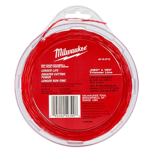 Le fil de coupe-bordures Milwaukee® 0,080 po utilise des polymères de haute qualité et une conception torsadée à masse complète pour offrir une durée de vie plus longue, une plus grande puissance de coupe et une durée de fonctionnement plus longue.