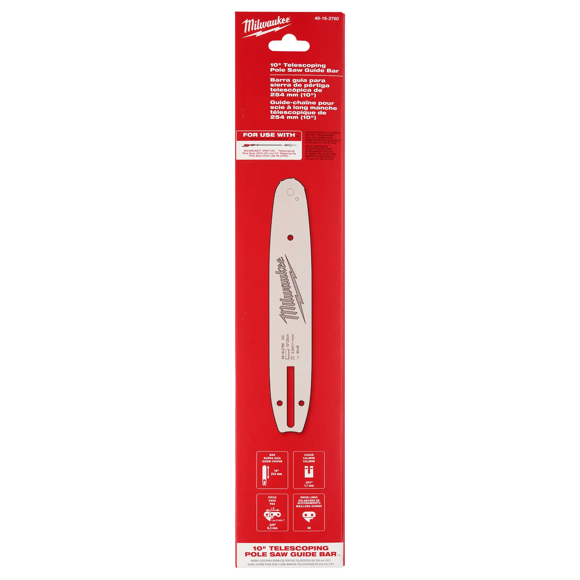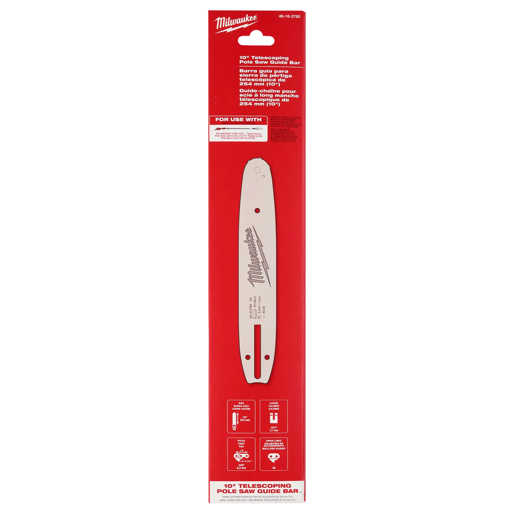 Le guide-chaîne télescopique de 10 po est destiné à être utilisé avec la scie à perche télescopique MILWAUKEE® M18™ FUEL™ et la chaîne de scie à perche télescopique de 10 po. La conception optimisée du guide-chaîne maximise l'efficacité et la durée de vie grâce à un acier allié haute résistance et à des fonctions de lubrification avancées. Les composants de nez de qualité professionnelle du guide-chaîne et la conception du nez de pignon à petit rayon permettent des coupes précises et fluides.