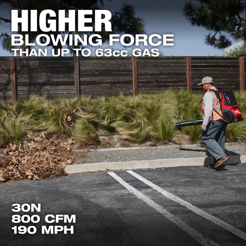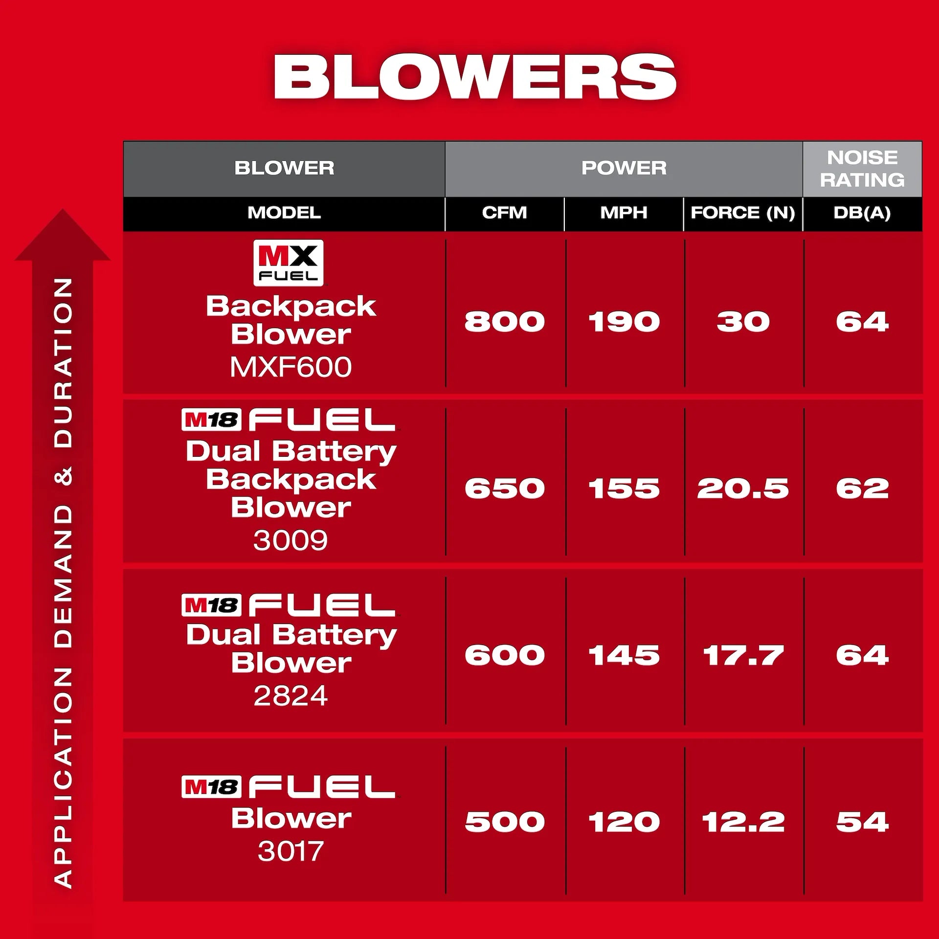 Le souffleur dorsal Milwaukee MX FUEL™ offre une puissance de soufflage supérieure à celle d'un souffleur à essence jusqu'à 63 cm³, permettant ainsi d'éliminer plus rapidement des débris plus lourds et des matériaux plus volumineux. Le moteur sans balais POWERSTATE™ délivre une puissance de 800 pi³/min, 190 mi/h et 30 newtons en mode élevé, tout en maintenant un niveau sonore de 64 dBA. Ce souffleur dorsal dispose de 3 modes de puissance, permettant d'optimiser les performances et l'autonomie en fonction des besoins de l'application. Les modes de puissance peuvent être sélectionnés par l'opérateur directement sur l'outil ou gérés et verrouillés à distance via l'application ONE-KEY™ depuis un appareil couplé, offrant ainsi un contrôle optimal des performances et une productivité accrue. Outre la gestion des performances, l'application ONE-KEY™ permet également de suivre l'utilisation et la localisation, de gérer son parc de souffleurs et de le verrouiller pour plus de sécurité et de protection de son investissement en cas de besoin. Le souffleur dorsal MX FUEL™ offre une autonomie de 20 à 45 minutes par charge lorsqu'il est associé à une batterie MX FUEL™ REDLITHIUM™ FORGE™ HD12.0 (non incluse). Il est également doté d'un harnais entièrement réglable, d'une buse télescopique et d'une poignée réglable en hauteur pour s'adapter aux besoins de chaque utilisateur. Compatible avec toutes les batteries MX FUEL™ REDLITHIUM™ et optimisé pour une utilisation avec les batteries MX FUEL™ REDLITHIUM™ FORGE™ HD12.0, le souffleur dorsal MX FUEL™ est également doté d'une buse télescopique et d'une poignée réglable en hauteur pour s'adapter aux besoins de chaque utilisateur.