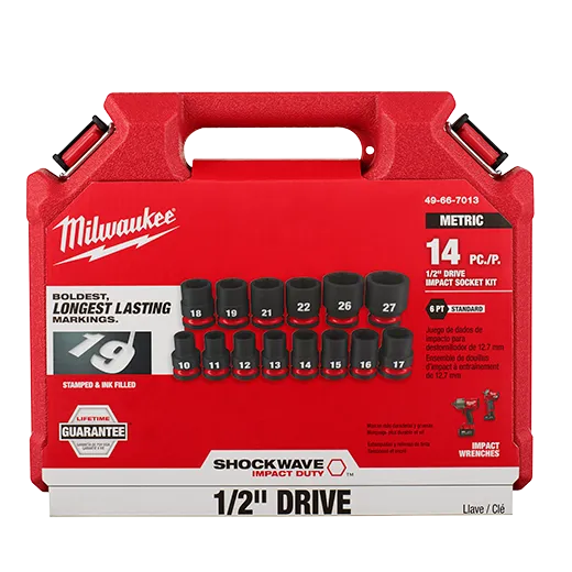 Les jeux de douilles à 6 pans 1/2" SHOCKWAVE™ Impact Duty™ de Milwaukee présentent les marquages les plus audacieux et les plus durables et une durabilité extrême aux chocs dans les applications à couple élevé. Le marquage de taille estampé et rempli d'encre vous permet de sélectionner la bonne douille à chaque fois tout au long de la durée de vie de la douille. Ces douilles sont conçues en acier forgé haute résistance pour des performances optimisées dans les applications intensives. La géométrie hexagonale antidérapante empêche l'arrondi des fixations, et une conception à double trou et une rainure annulaire permettent une fixation et un retrait faciles des douilles. Les boîtiers de rangement sont résistants aux chocs et s'emboîtent pour un empilage et un stockage faciles. Toutes les douilles MILWAUKEE® SHOCKWAVE™ Impact Duty™ bénéficient d'une garantie à vie et sont conformes aux normes industrielles ASME.